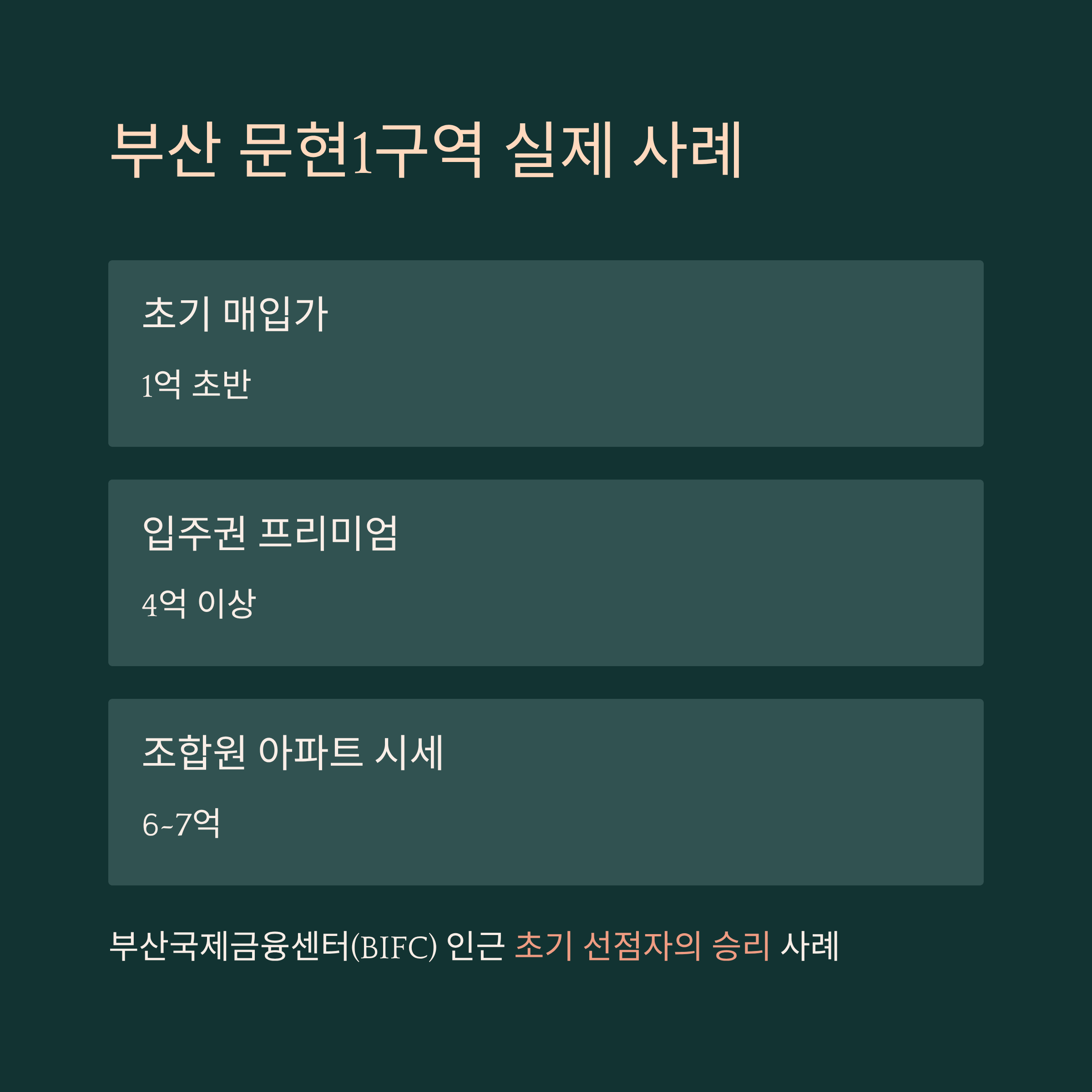 문현1구역은 특히 '초기 선점자'의 승리라고 불려요. 조합 설립 이전에 매입한 사람들은 시세차익을 극대화할 수 있었던 반면, 후반부 진입자들은 분담금 상승과 분양가 부담으로 수익률이 크게 줄었거든요.