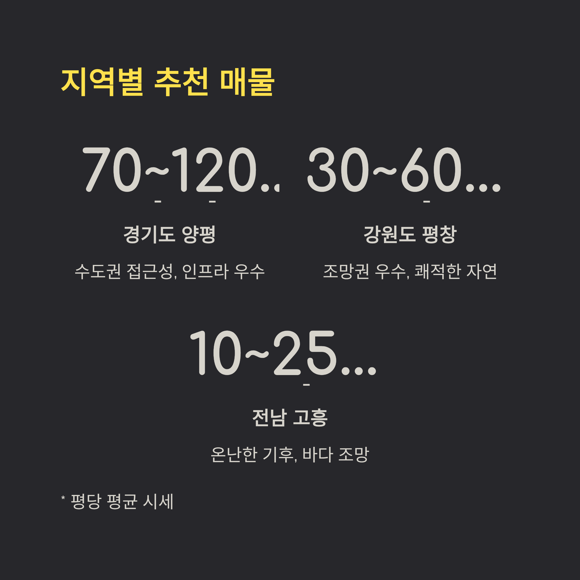 | 강원도 평창 | 30~60만 원 | 조망권 우수, 쾌적한 자연 | 귀촌, 세컨하우스 |