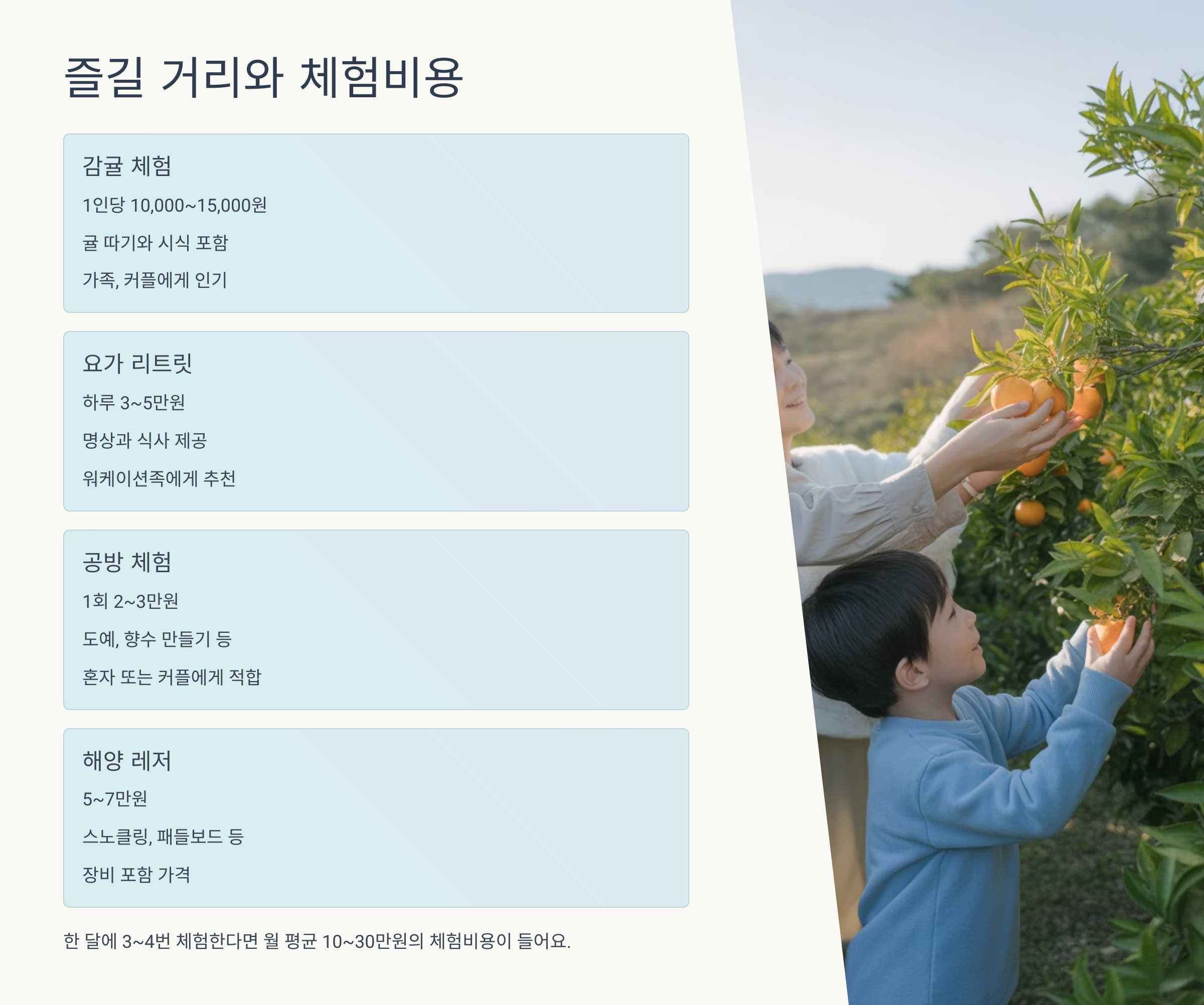 대표적인 체험 활동 중 하나는 '감귤체험'이에요. 보통 1인당 10,000~15,000원으로 귤 따기와 시식까지 포함돼 있어서 가족 단위나 커플들에게 인기죠. 또 ‘요가 리트릿’은 하루 3만 원~5만 원 정도로 명상과 식사까지 제공되며 워케이션족에게 특히 추천해요.