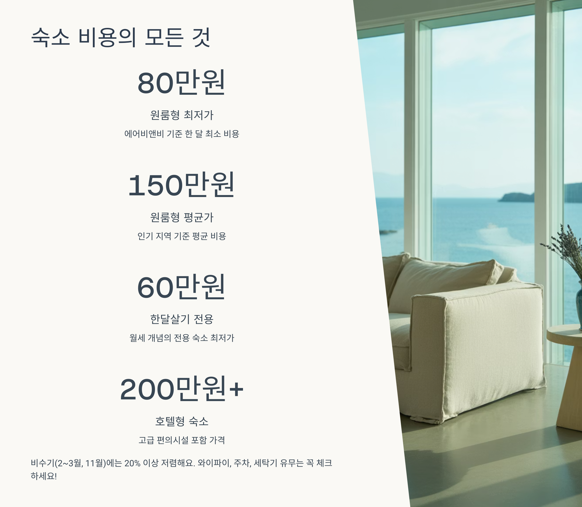 2025년 기준으로 원룸형 에어비앤비 숙소는 한 달 기준 80만 원에서 150만 원 사이예요. 콘도나 독채 민박은 150만 원 이상이 일반적이고, 호텔형 장기 투숙은 최소 200만 원부터 시작해요. 최근에는 장기 여행자를 위한 ‘한달살기 전용 숙소’도 많이 생겼는데요, 월세 개념이라 60~100만 원으로 꽤 괜찮은 선택이에요.