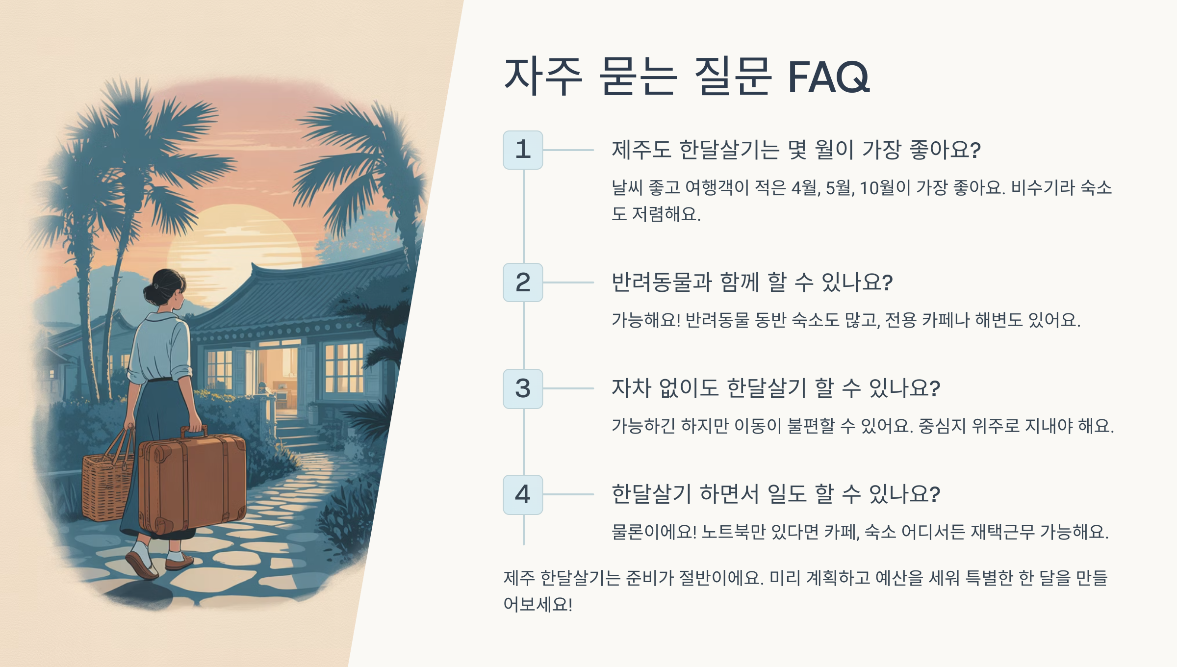 절약 팁 하나! 월 단위 숙소는 SNS나 커뮤니티(제주 한달살기 오픈채팅, 네이버 카페 등)에서 찾는 게 훨씬 싸고 정보도 좋아요. 그리고 숙소 위치를 버스 정류장 근처로 하면 차 없이도 어느 정도 생활 가능하답니다!
