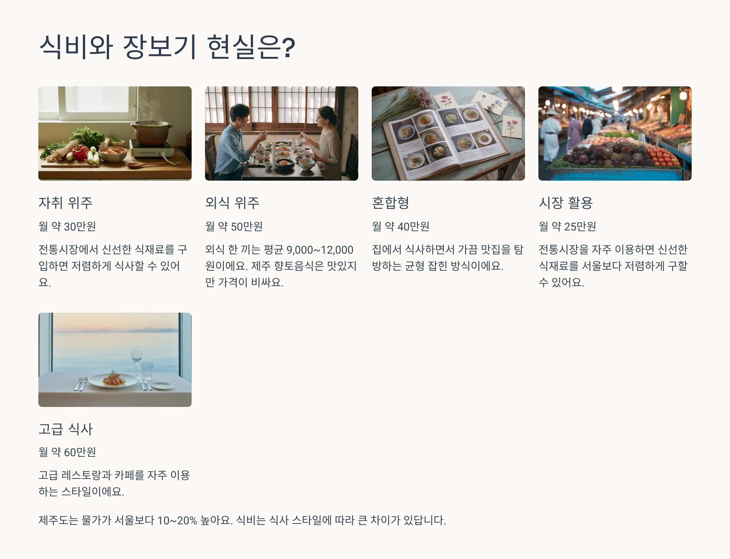 외식을 할 경우, 보통 한 끼 평균 9,000~12,000원 수준이에요. 고기국수나 갈치조림 같은 제주 향토음식은 맛있지만 가격이 꽤 나가요. 그래서 한 달 외식을 계속 한다면 식비가 40만 원을 훌쩍 넘기기 쉬워요.
