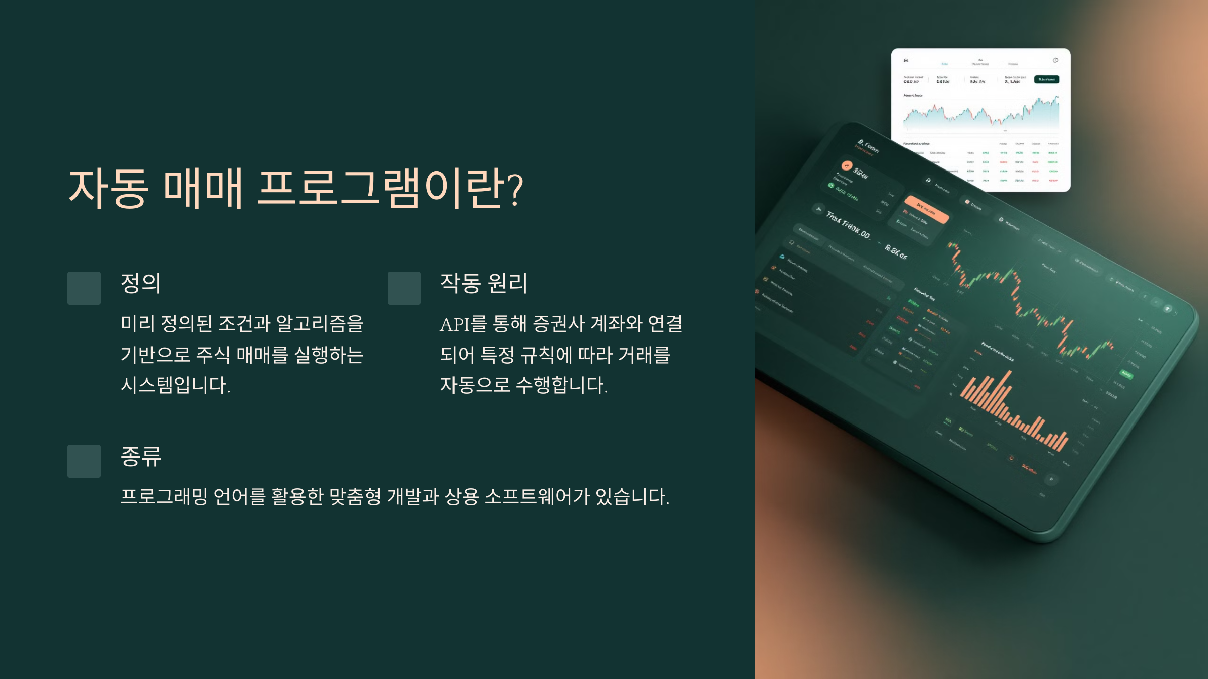 자동 매매 프로그램은 미리 정의된 조건과 알고리즘을 기반으로 주식 매매를 실행하는 시스템이에요. 이를 통해 투자자는 직접 매수와 매도를 일일이 신경 쓰지 않고도 시장 움직임에 대응할 수 있답니다. 이런 프로그램은 보통 API(Application Programming Interface)를 통해 증권사 계좌와 연결되며, 특정 규칙에 따라 거래를 자동으로 수행해요.