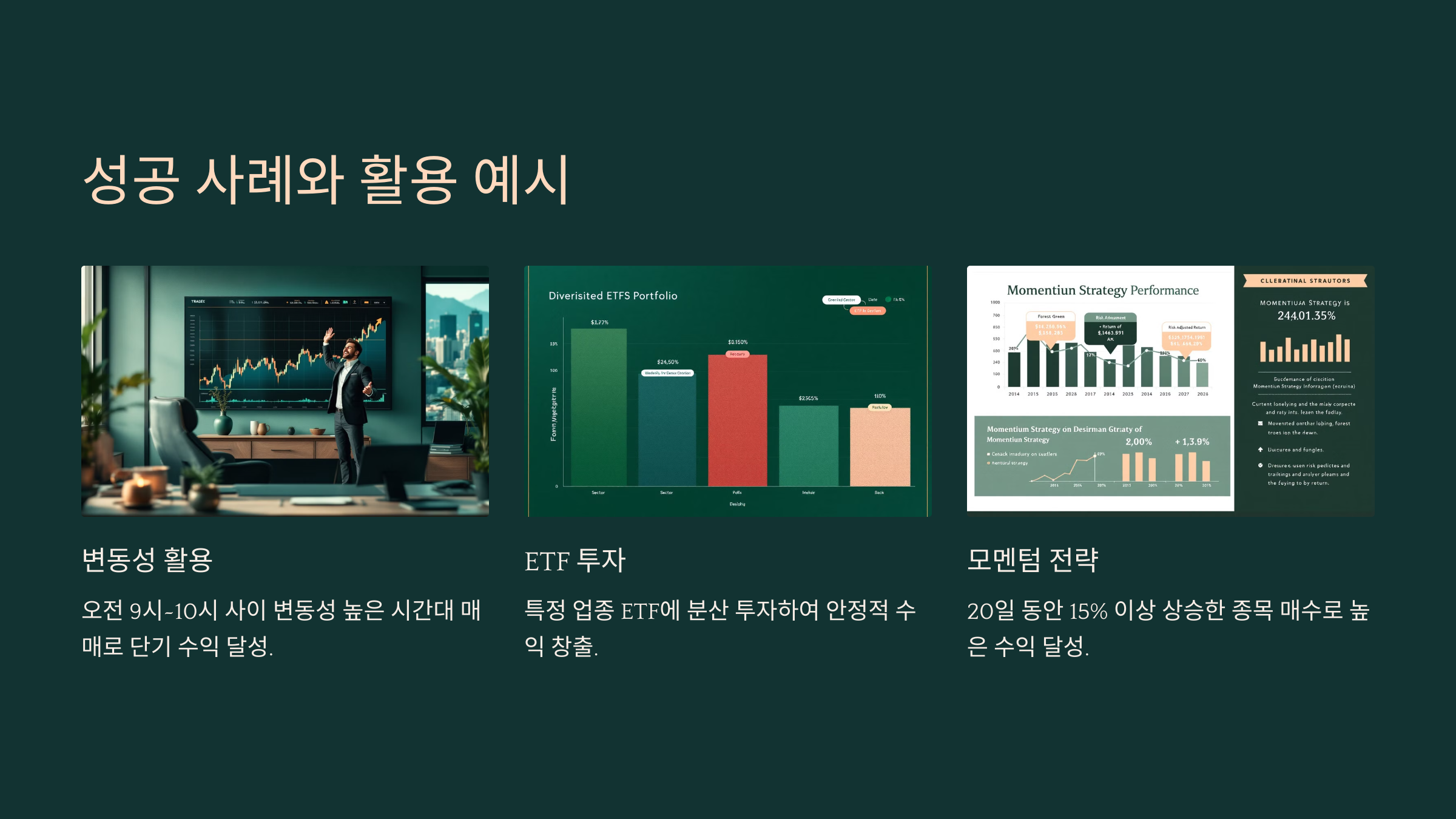 모멘텀 전략을 사용해 단기적으로 높은 수익을 낸 사례도 있는데요. 한 투자자는 20일 동안 15% 이상 상승한 종목만 매수하도록 프로그램을 설정한 뒤, 추가 상승을 노리는 전략을 통해 높은 수익을 거두었어요. 물론 이 경우 리스크 관리를 철저히 해야 해요.