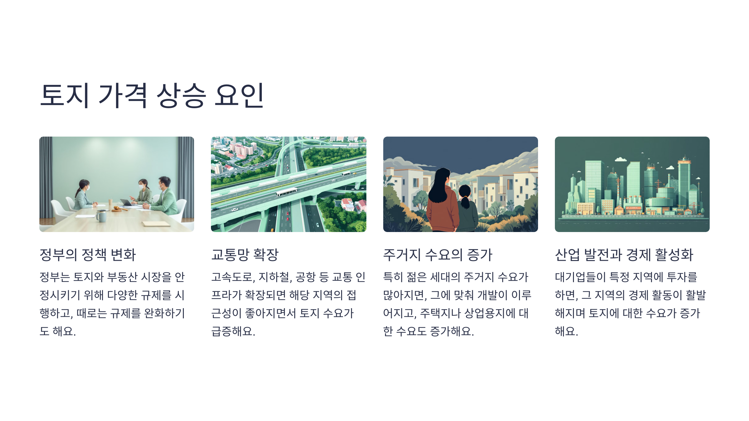 네 번째는 **산업 발전과 경제 활성화**입니다. 대기업들이 특정 지역에 투자를 하면, 그 지역의 경제 활동이 활발해지며 토지에 대한 수요가 증가해요. 또한, 기업들이 특정 지역에 새로운 공장이나 연구소를 건설할 경우, 그 지역의 토지 가치는 급격히 상승할 수 있어요.