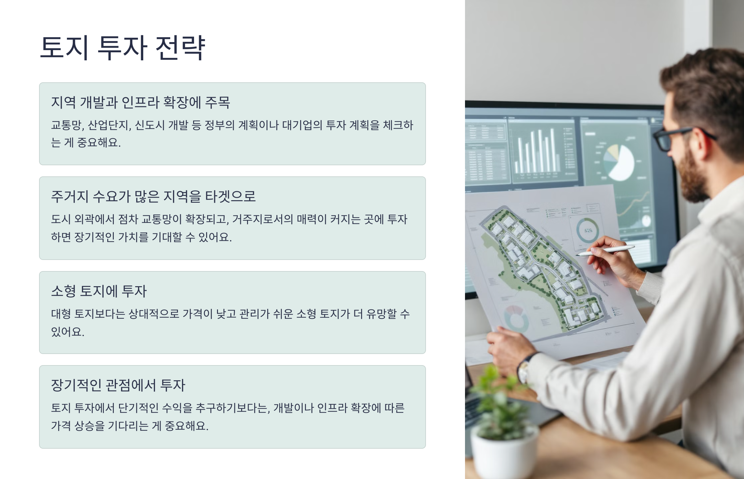 마지막 전략은 **장기적인 관점에서 투자하는 것**이에요. 토지 투자에서 단기적인 수익을 추구하기보다는, 개발이나 인프라 확장에 따른 가격 상승을 기다리는 게 중요해요. 따라서 장기적인 시각으로 투자하고, 그 지역의 발전 가능성에 대한 충분한 조사를 해야 해요.