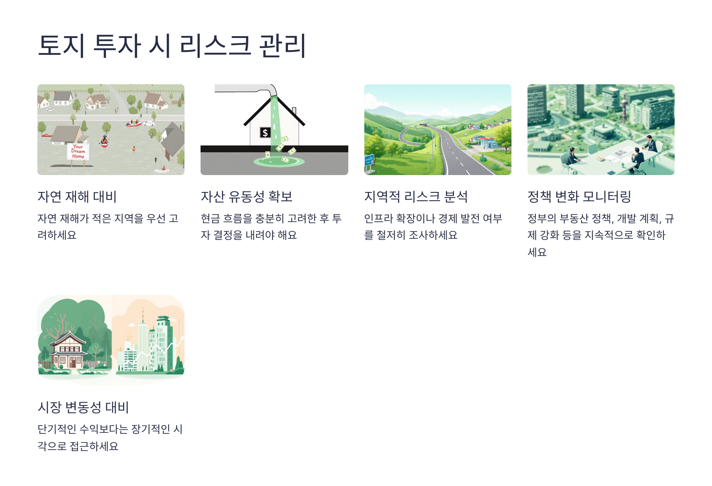 세 번째 리스크는 **지역적 리스크**예요. 특정 지역의 인프라 확장이나 경제 발전 여부에 따라 토지 가격이 크게 달라질 수 있어요. 특히 교통망이 확장될 예정인 지역이나, 산업단지가 개발되는 지역은 상승 여력이 있지만, 인프라나 경제 발전이 예상보다 더디게 진행될 경우 토지 가격이 정체되거나 하락할 수 있어요.