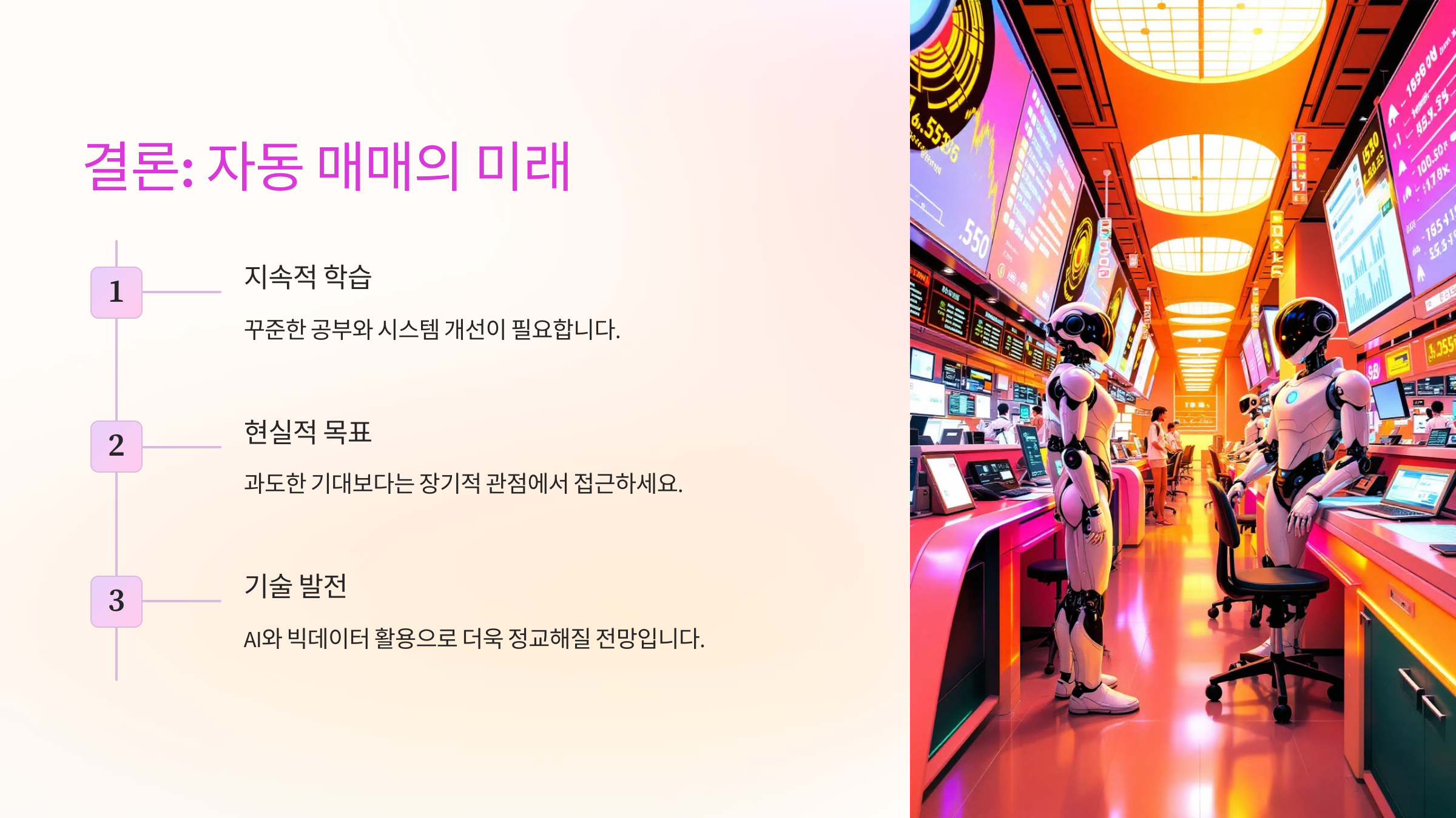 자동 매매는 분명히 효율적이고 매력적인 도구지만, 성공을 위해서는 노력과 지식이 필요하다는 점을 잊지 말아야 해요. 장기적인 관점에서 꾸준히 시스템을 업그레이드하고 성과를 분석한다면, 더 나은 결과를 얻을 수 있을 거예요.