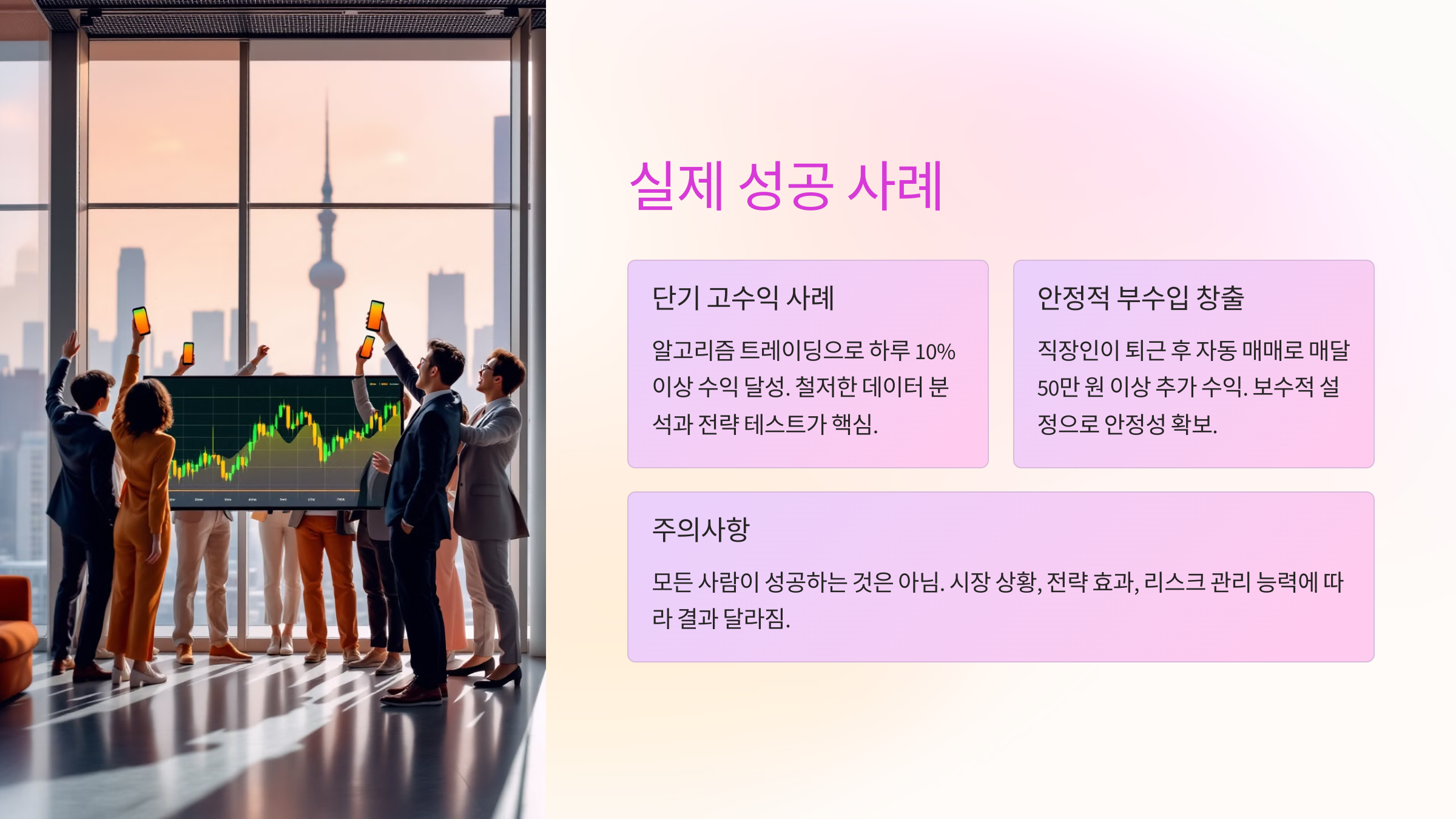 또 다른 사례로는, 중소기업에 다니는 한 직장인이 퇴근 후 자동 매매 프로그램을 설정해 매달 꾸준히 50만 원 이상의 추가 수익을 창출한 이야기가 있어요. 그는 매매 조건을 보수적으로 설정해 안정성을 높였다고 해요.