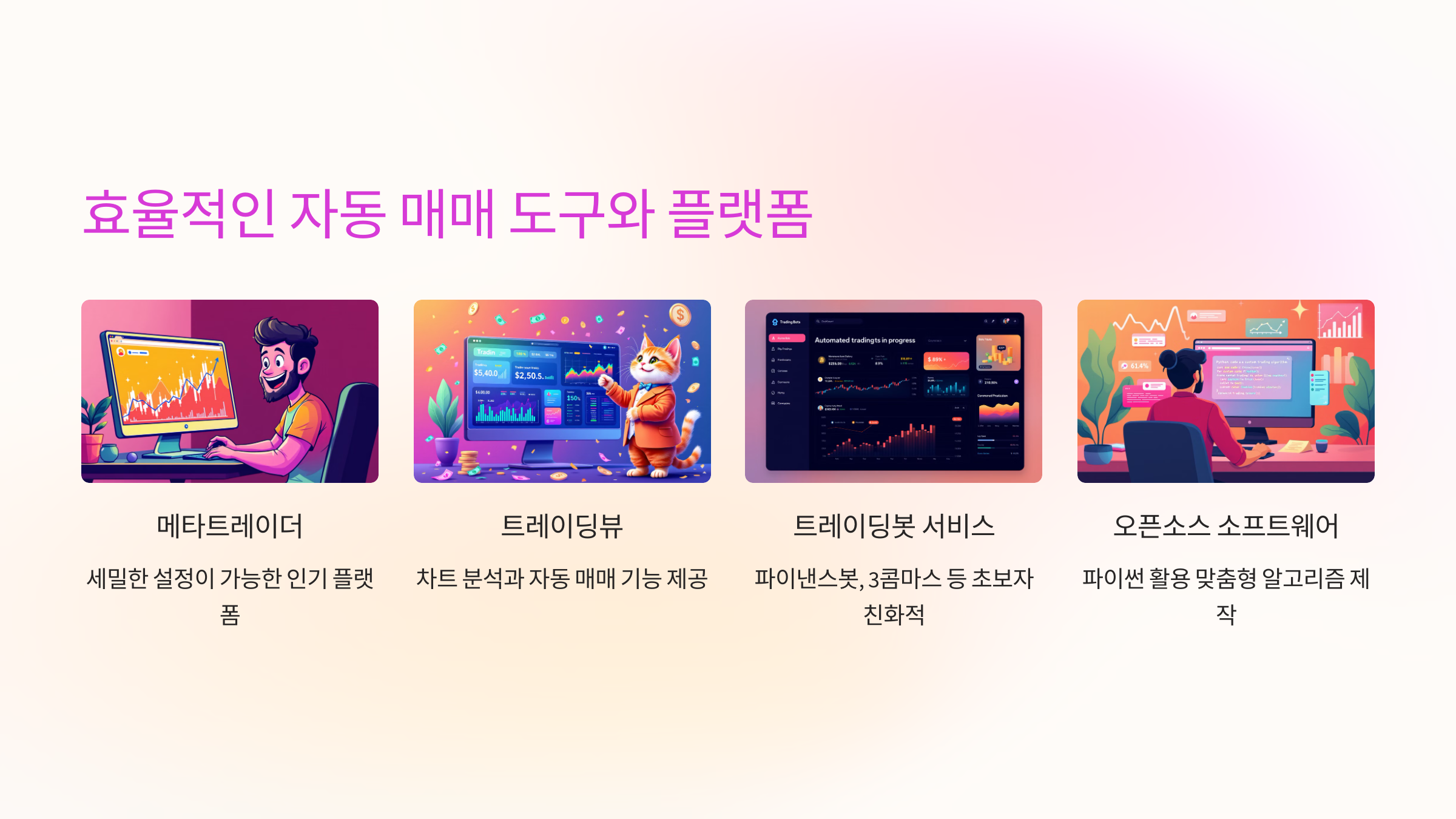 자동 매매를 시작하려면 효과적인 도구와 플랫폼을 선택하는 것이 중요해요. 일반적으로 많이 쓰이는 플랫폼으로는 메타트레이더(MetaTrader), 트레이딩뷰(TradingView), 파이썬 기반의 알고리즘 트레이딩 등이 있어요. 이들은 사용자의 요구에 맞게 세밀한 설정이 가능하답니다.