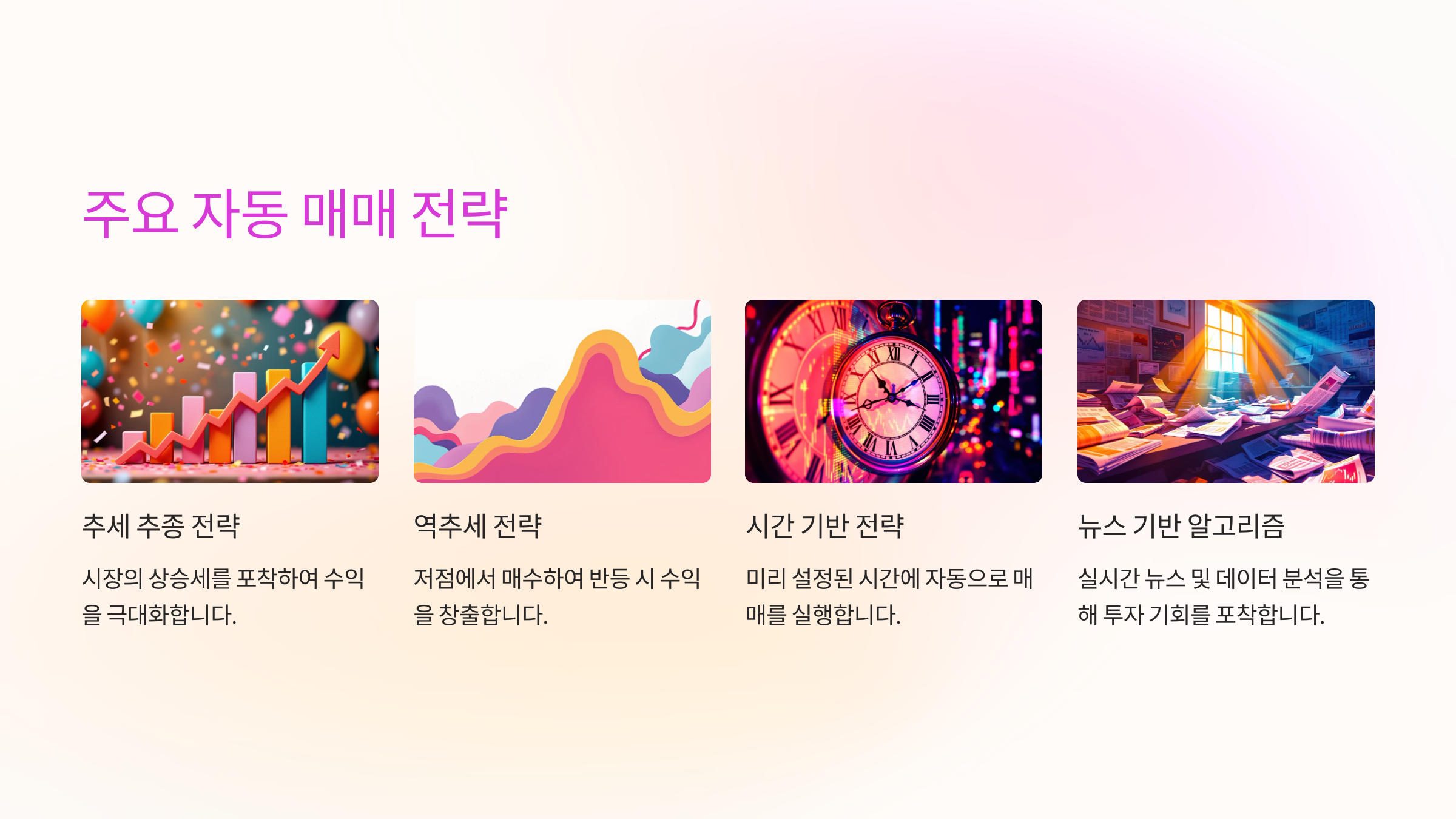 A3. 수익률은 전략과 시장 상황에 따라 달라져요. 자동 매매는 보장이 아닌, 가능성을 높이는 도구예요.