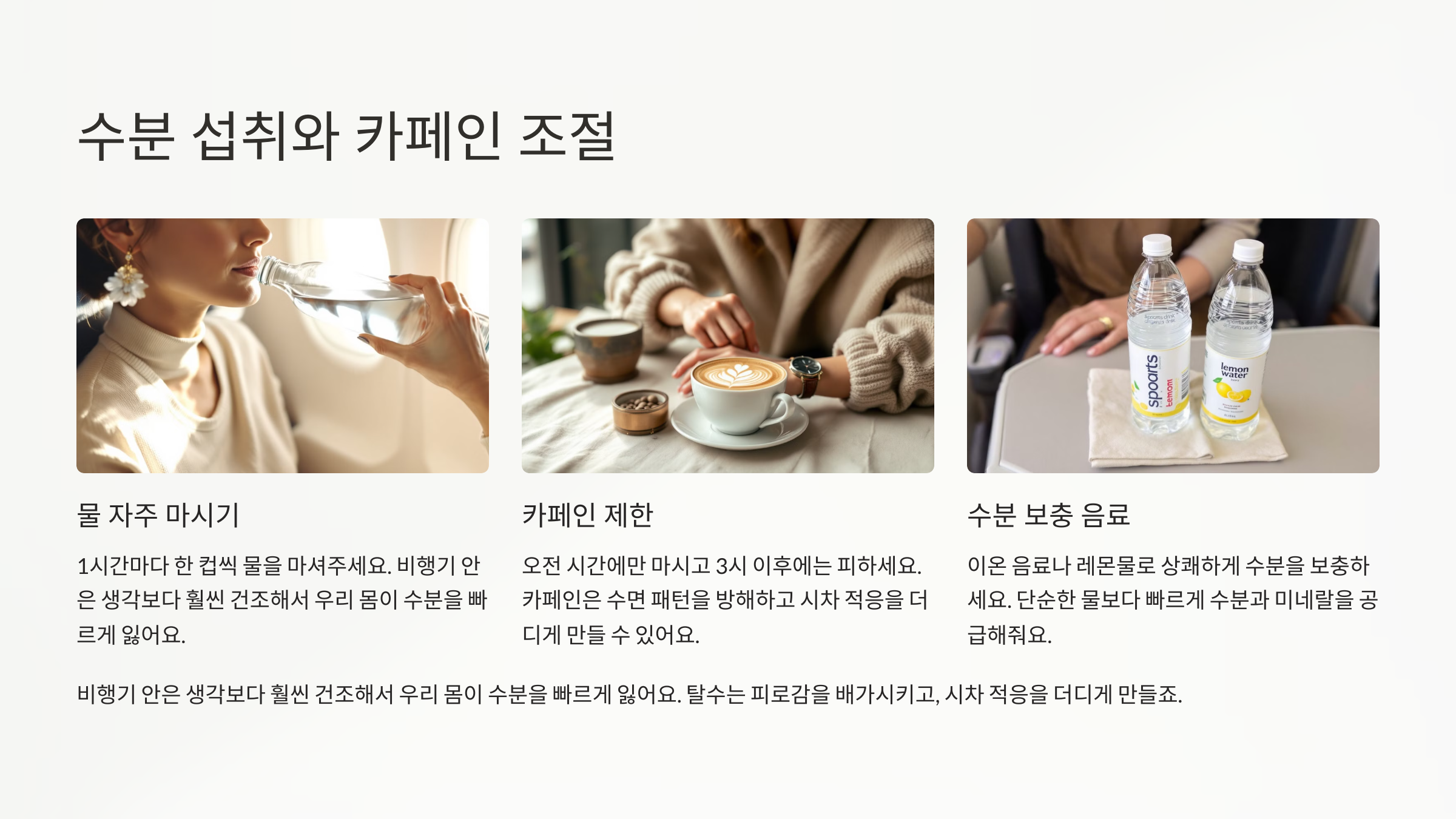 비행기 안은 생각보다 훨씬 건조해서 우리 몸이 수분을 빠르게 잃어요. 탈수는 피로감을 배가시키고, 시차 적응을 더디게 만들죠. 여행 중 시차 적응을 빠르게 하려면, ‘물’만큼 중요한 게 없어요! 그래서 장거리 비행 시에는 1시간마다 한 컵씩 물을 마셔주는 게 좋아요.