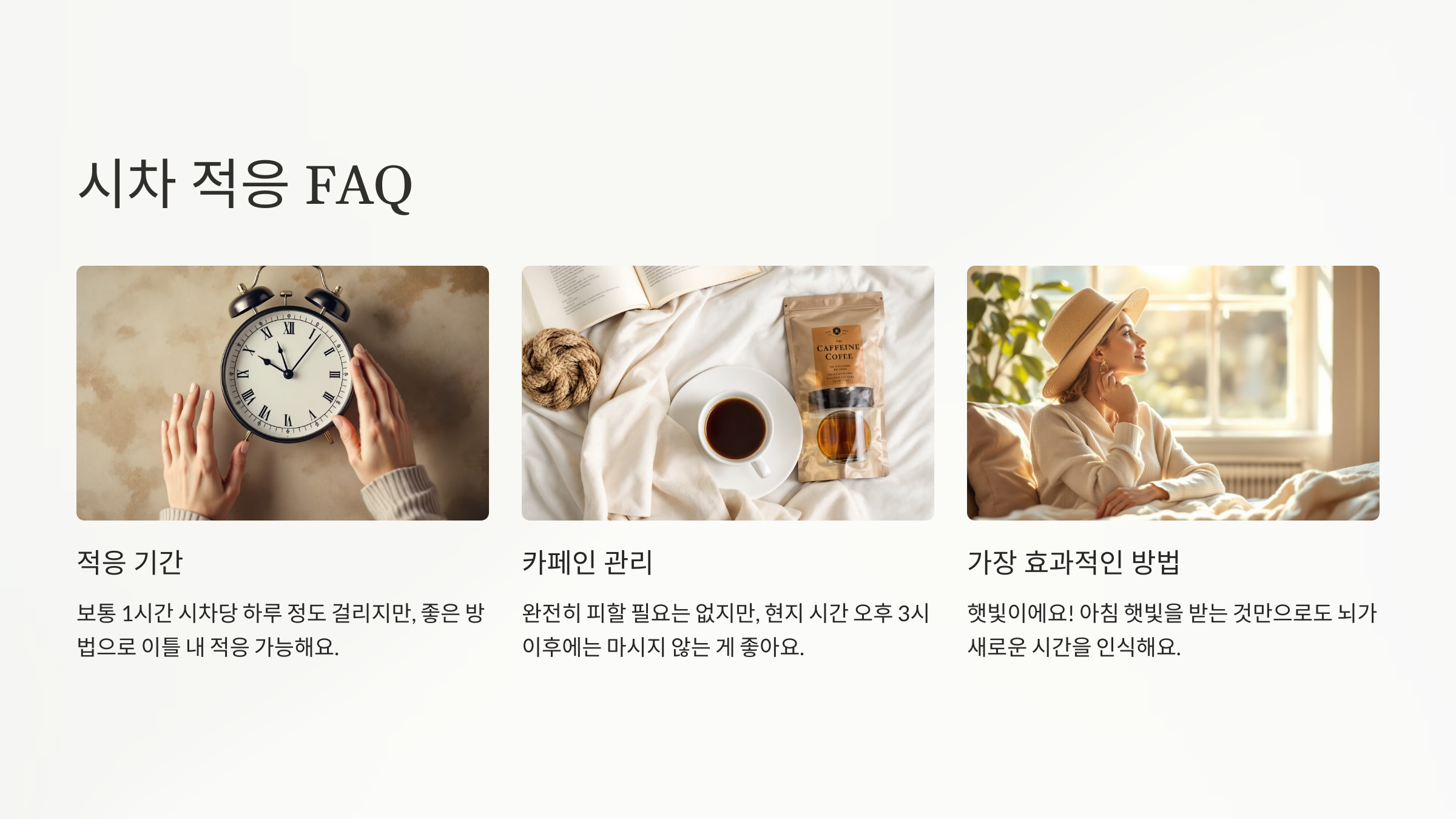 결국 모두의 전략에는 공통점이 있어요. 바로 **현지 시간 기준에 맞춰 일찍 적응하려고 노력했다는 것!** 강제로라도 몸을 새 시간대에 끼워 넣는 게 성공의 열쇠예요 🔑