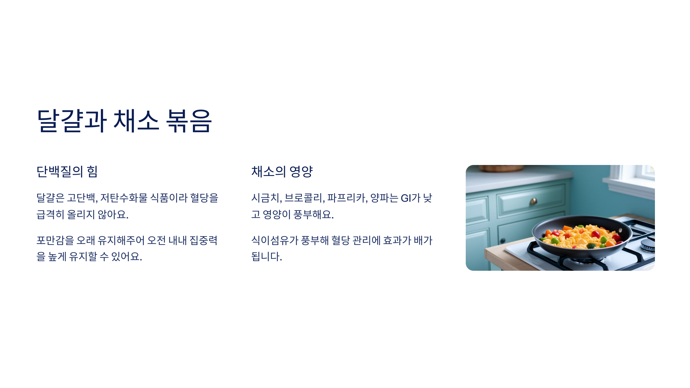 혈당을 안정적으로 관리하기 위해서 단백질 섭취는 정말 중요해요. 그중에서도 달걀은 아침 식사로 완벽한 선택이에요. 고단백, 저탄수화물 식품이라 혈당을 급격히 올리지 않고 포만감을 오래 유지해줘요.