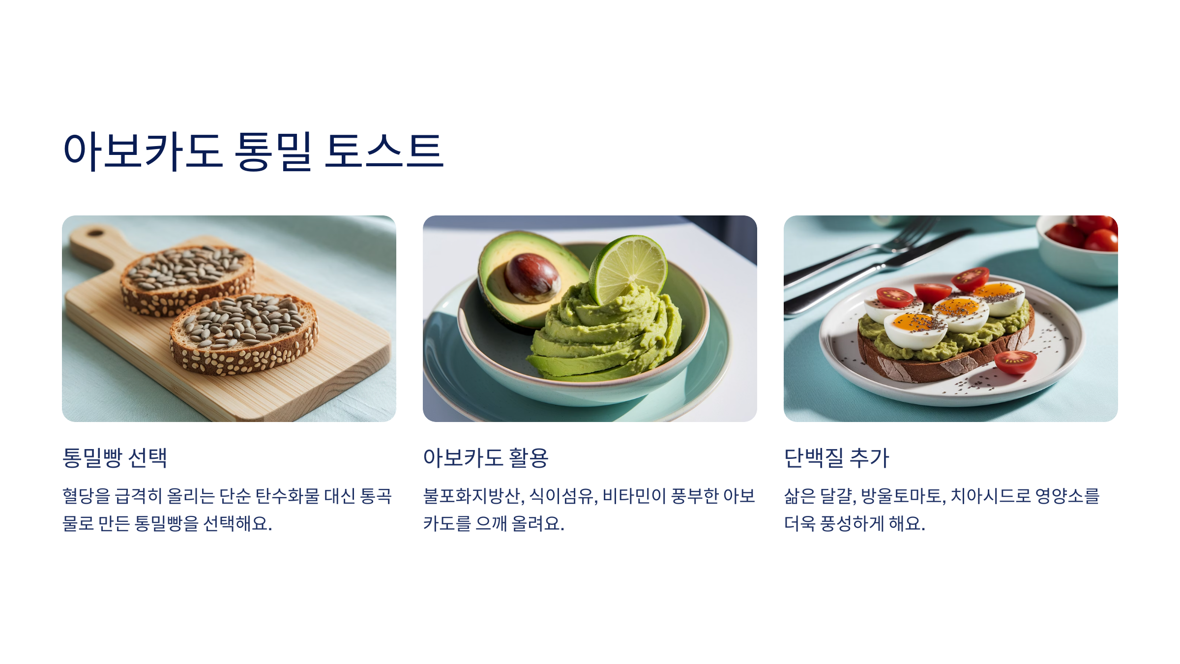 혈당을 급격히 올리는 단순 탄수화물 대신 통곡물로 만든 통밀빵을 선택하고, 그 위에 으깬 아보카도를 얹으면 완벽한 저GI 아침 식사가 완성돼요. 식이섬유와 건강한 지방의 조화는 혈당을 안정적으로 유지시켜 준답니다.