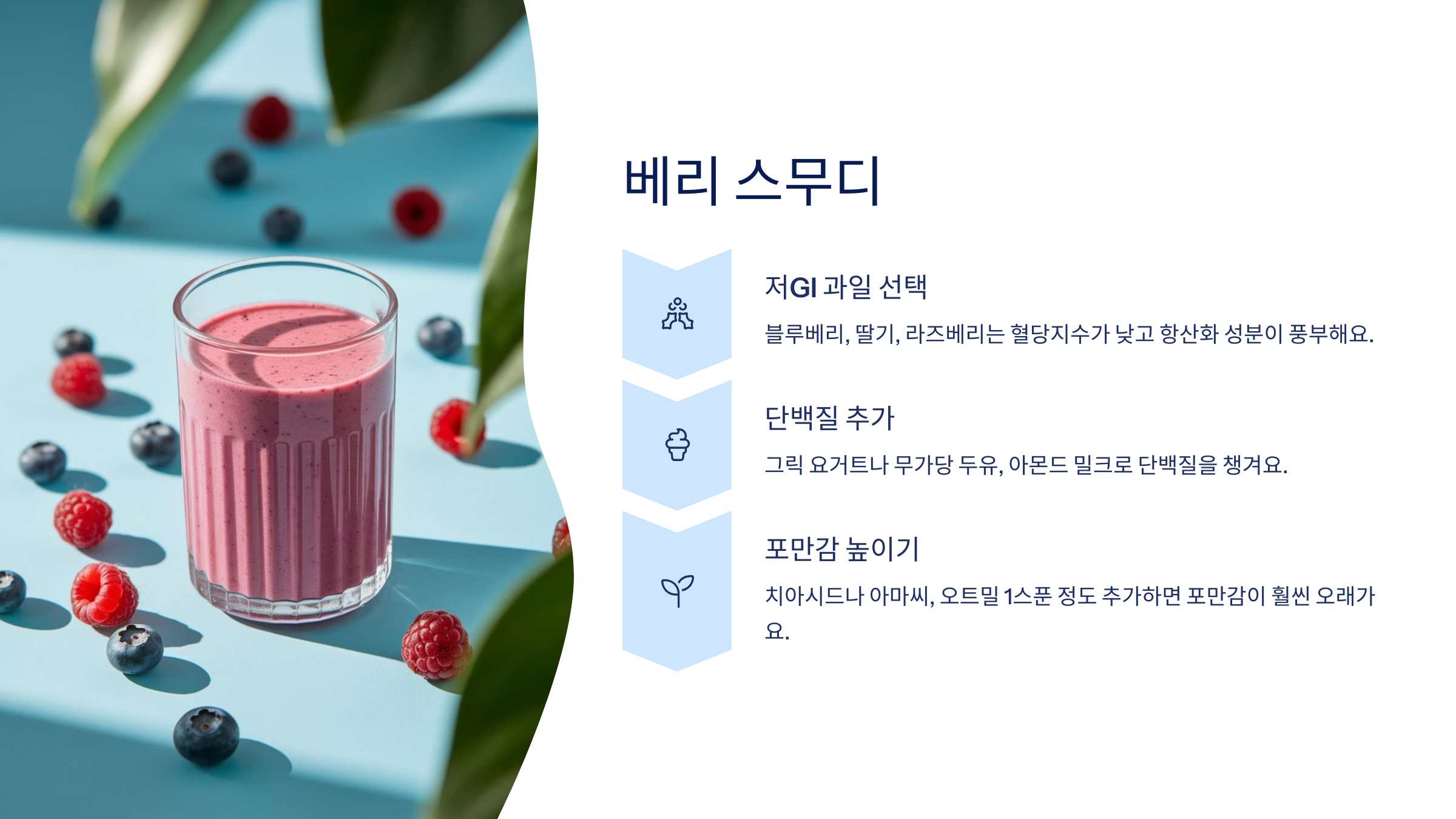 아침에 상큼하게 시작하고 싶다면 베리 스무디가 정말 좋은 선택이에요. 블루베리, 딸기, 라즈베리 같은 베리는 혈당지수가 낮고 항산화 성분이 풍부해서 혈당 관리에 아주 효과적이에요.