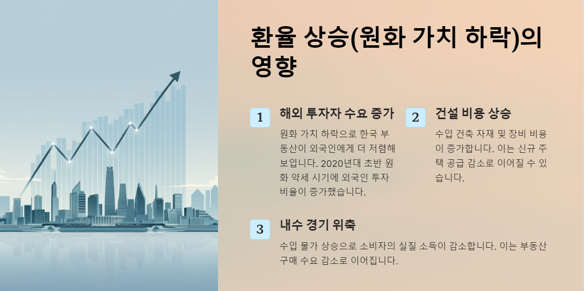 환율과 부동산 시장은 경제 전반과 밀접하게 연관되어 있습니다. 특히 원화 가치 하락(환율 상승)이나 원화 강세(환율 하락)는 부동산 가격, 수요, 공급에 다양한 방식으로 영향을 미칩니다. 이러한 복잡한 상관관계를 이해하면 시장 참여자들이 변화하는 경제 상황 속에서 현명한 투자 결정을 내릴 수 있습니다. 본 글에서는 환율 상승과 하락이 부동산 시장에 미치는 단기적 및 장기적 영향을 분석하고, 투자자들이 주목해야 할 포인트를 짚어봅니다.