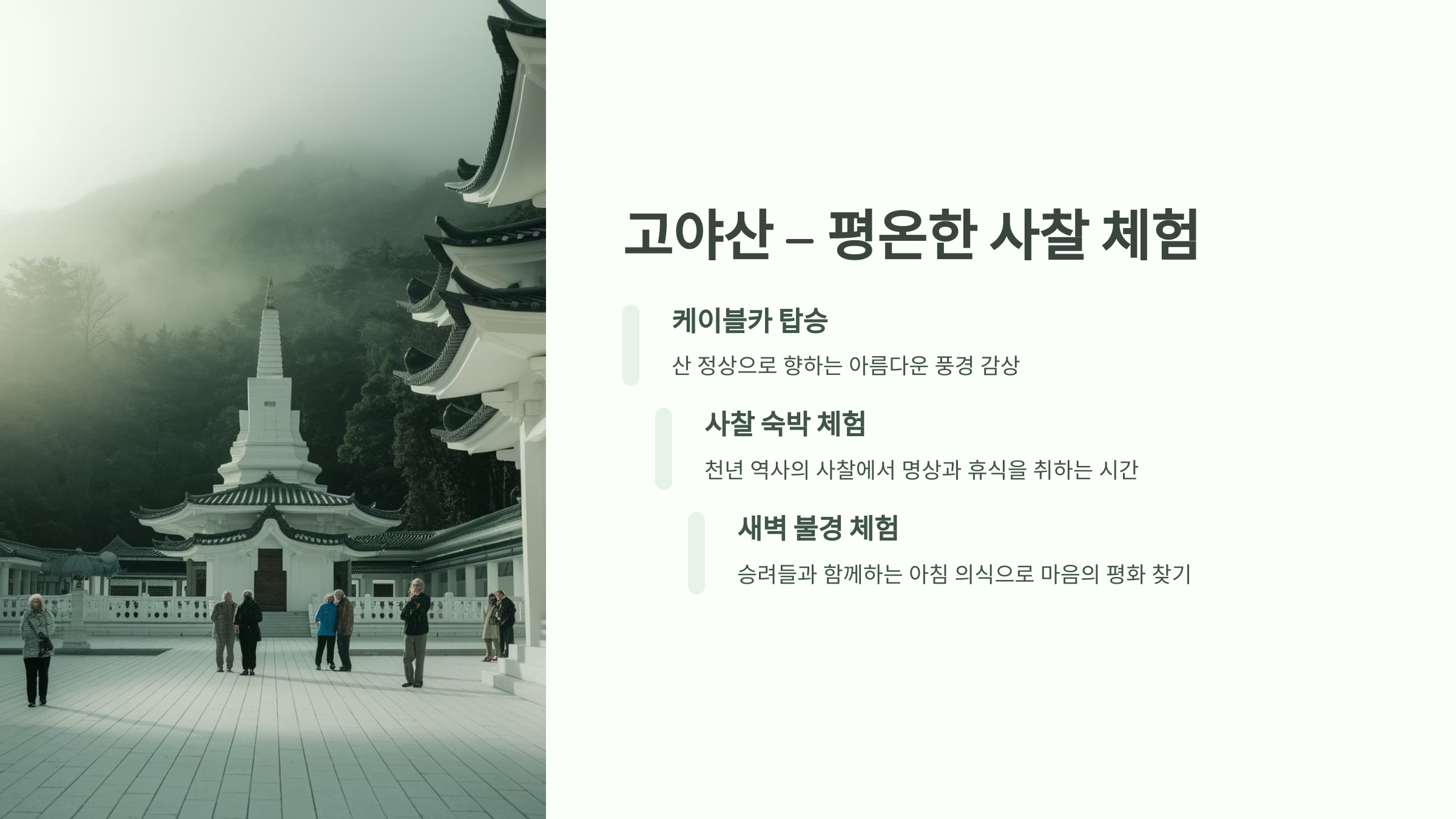 여기에서는 ‘사찰 숙박(슈쿠보)’ 체험이 가능해요. 전통 사찰에서 하룻밤을 보내며, 승려들과 함께 채식을 하고 새벽 참선도 참여할 수 있어요. 부모님과 함께 조용히 자연 속에서 하루를 보내는 건 정말 색다른 경험이 될 거예요.
