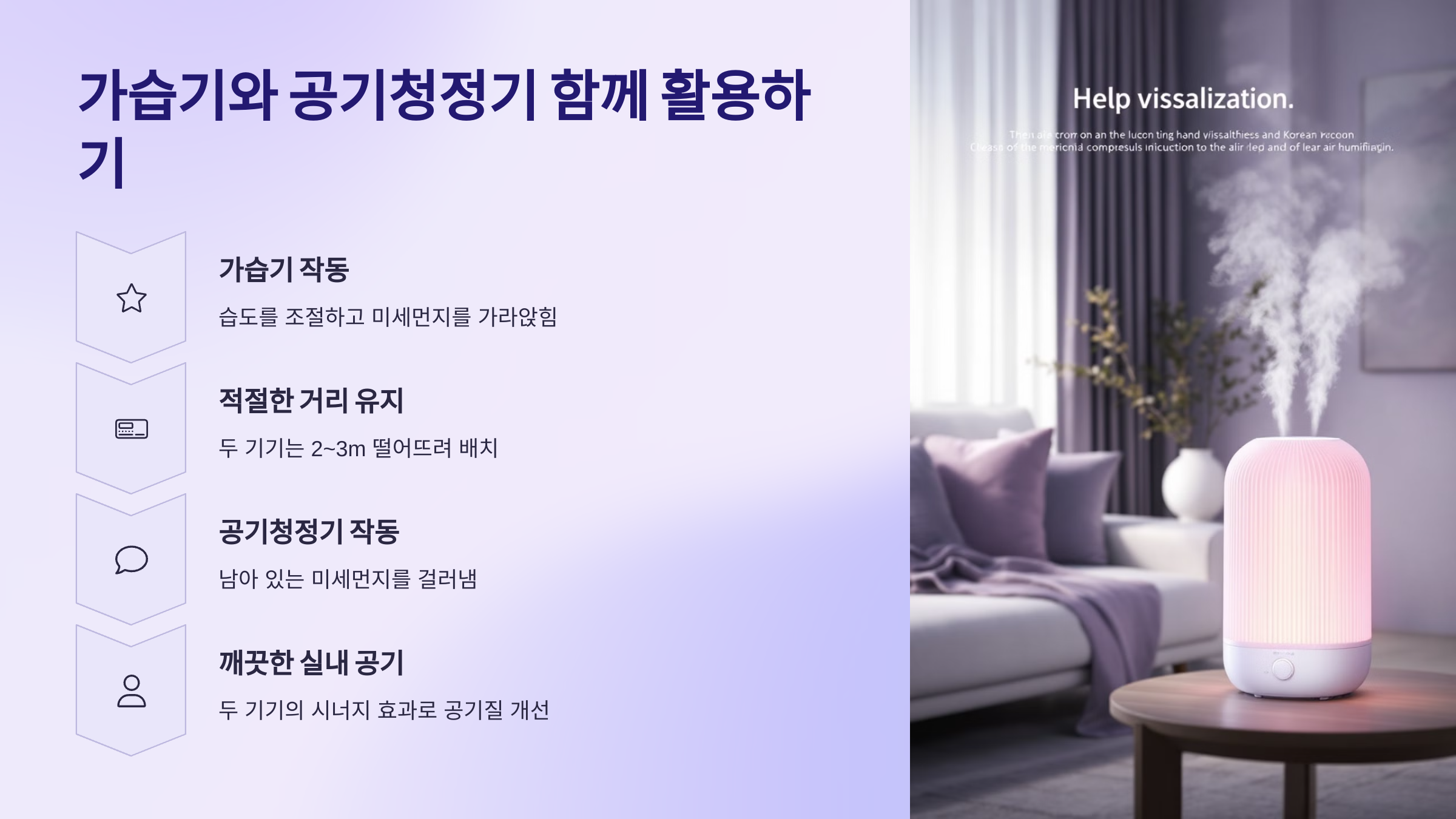 가습기는 공기 중 미세먼지를 가라앉히는 역할을 하고, 공기청정기는 남아 있는 미세먼지를 걸러내요. 이 두 가지를 적절히 조합하면 보다 깨끗하고 쾌적한 실내 환경을 유지할 수 있어요.