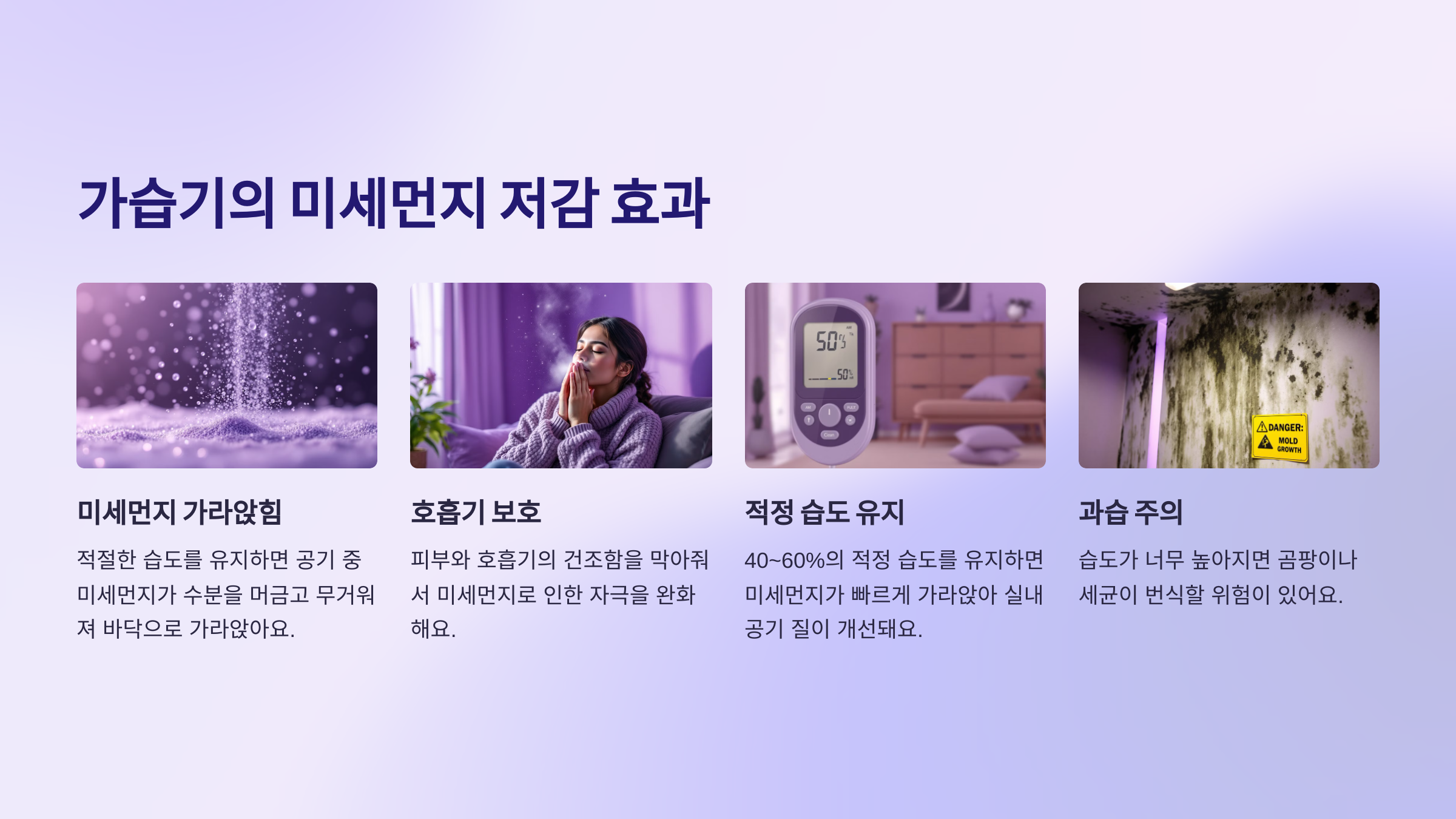 가습기는 종류마다 작동 방식이 다르고, 각각 장단점이 있어요. 미세먼지 저감 효과를 높이고 건강을 지키려면 올바른 제품을 선택하는 것이 중요해요.