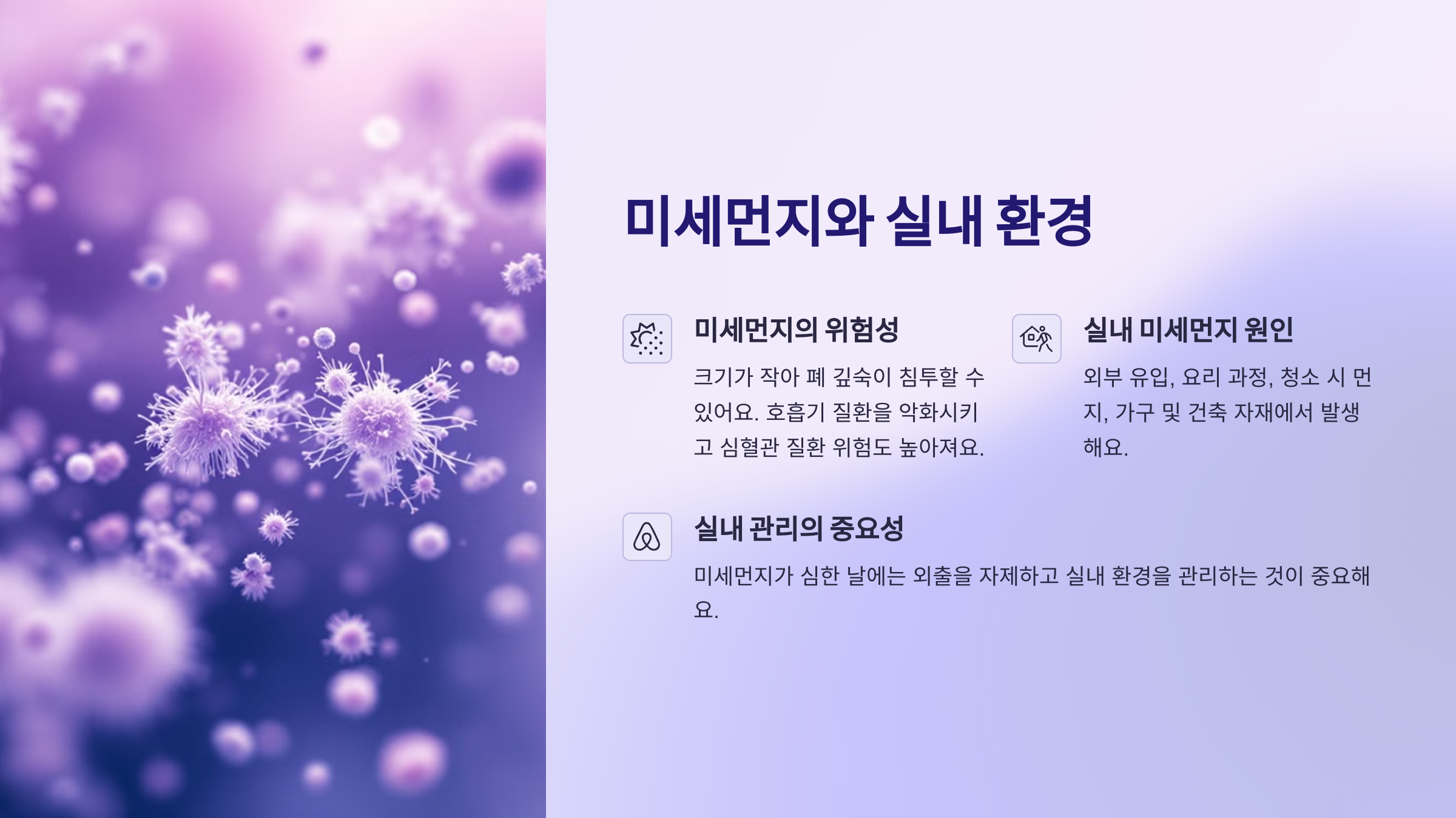 이처럼 실내에서도 다양한 원인으로 미세먼지가 발생할 수 있어요. 따라서 공기 질을 개선하기 위해서는 적절한 습도를 유지하고, 먼지를 효과적으로 제거하는 것이 중요해요.