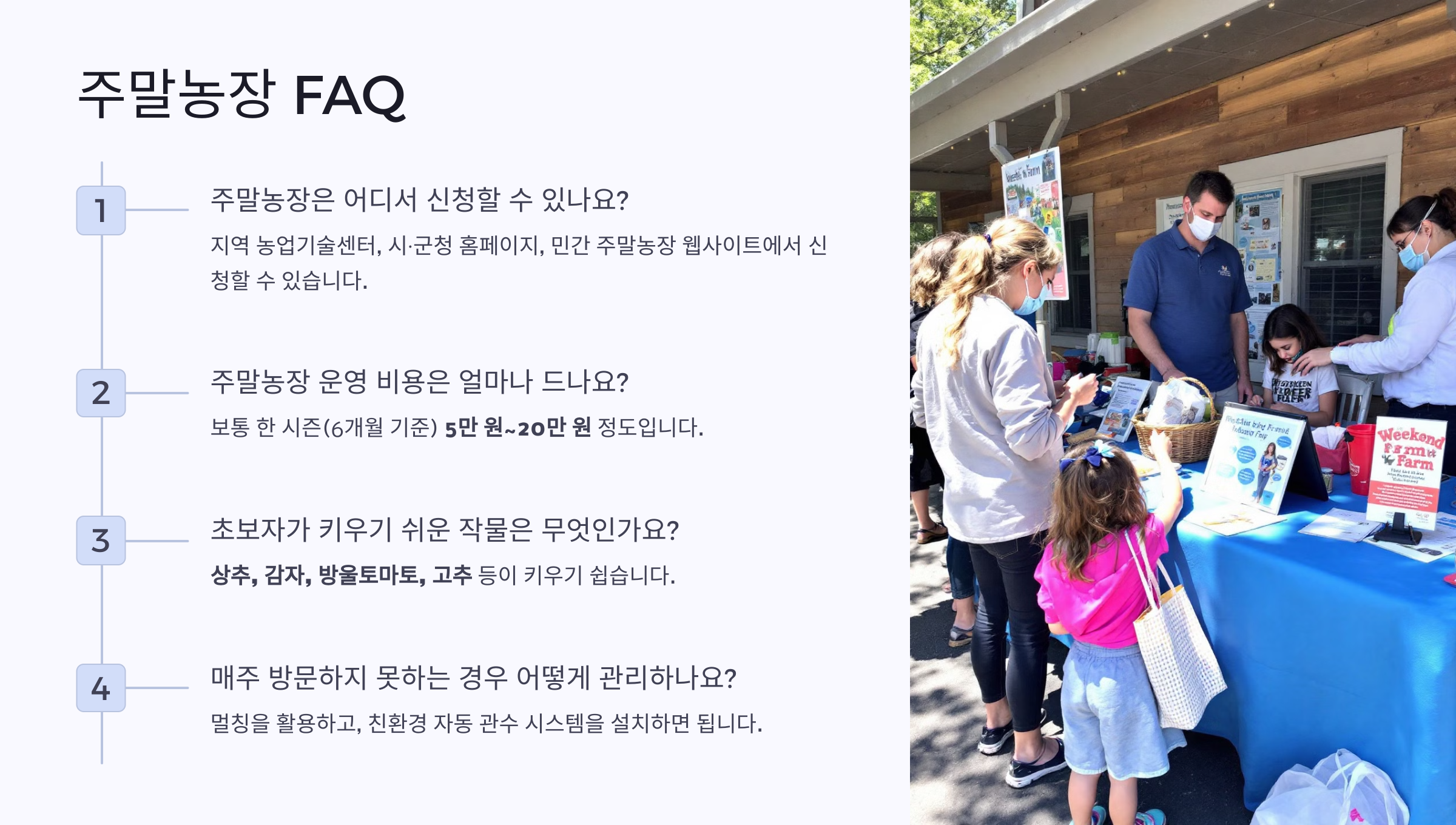 A1. 지역 농업기술센터, 시·군청 홈페이지, 또는 민간 주말농장 웹사이트에서 신청할 수 있어요. 가까운 농장을 직접 방문해 문의하는 것도 좋아요.