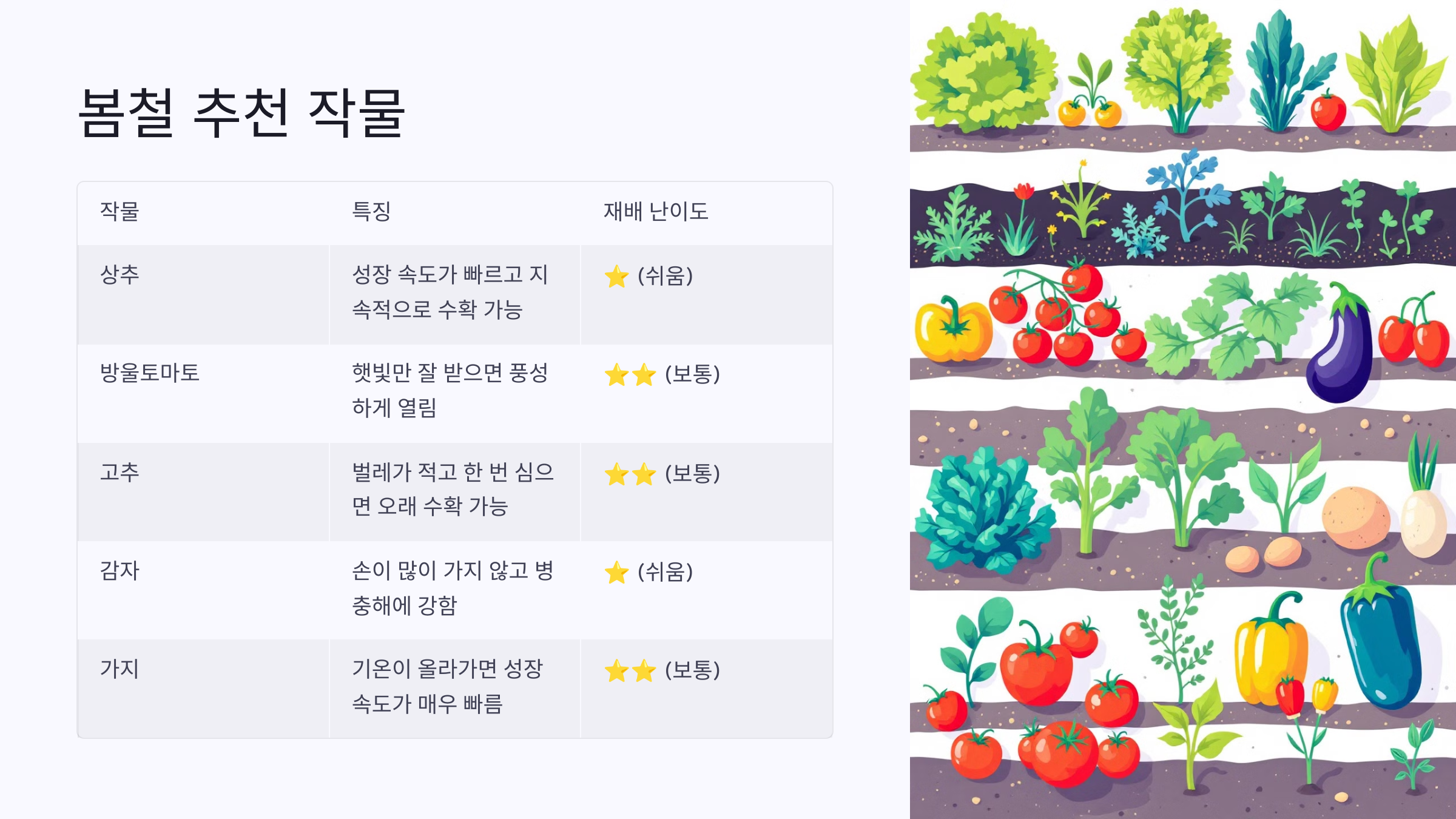이 중에서도 **상추, 감자, 방울토마토**는 물과 햇빛만 잘 관리해주면 쉽게 키울 수 있어요! 🌞