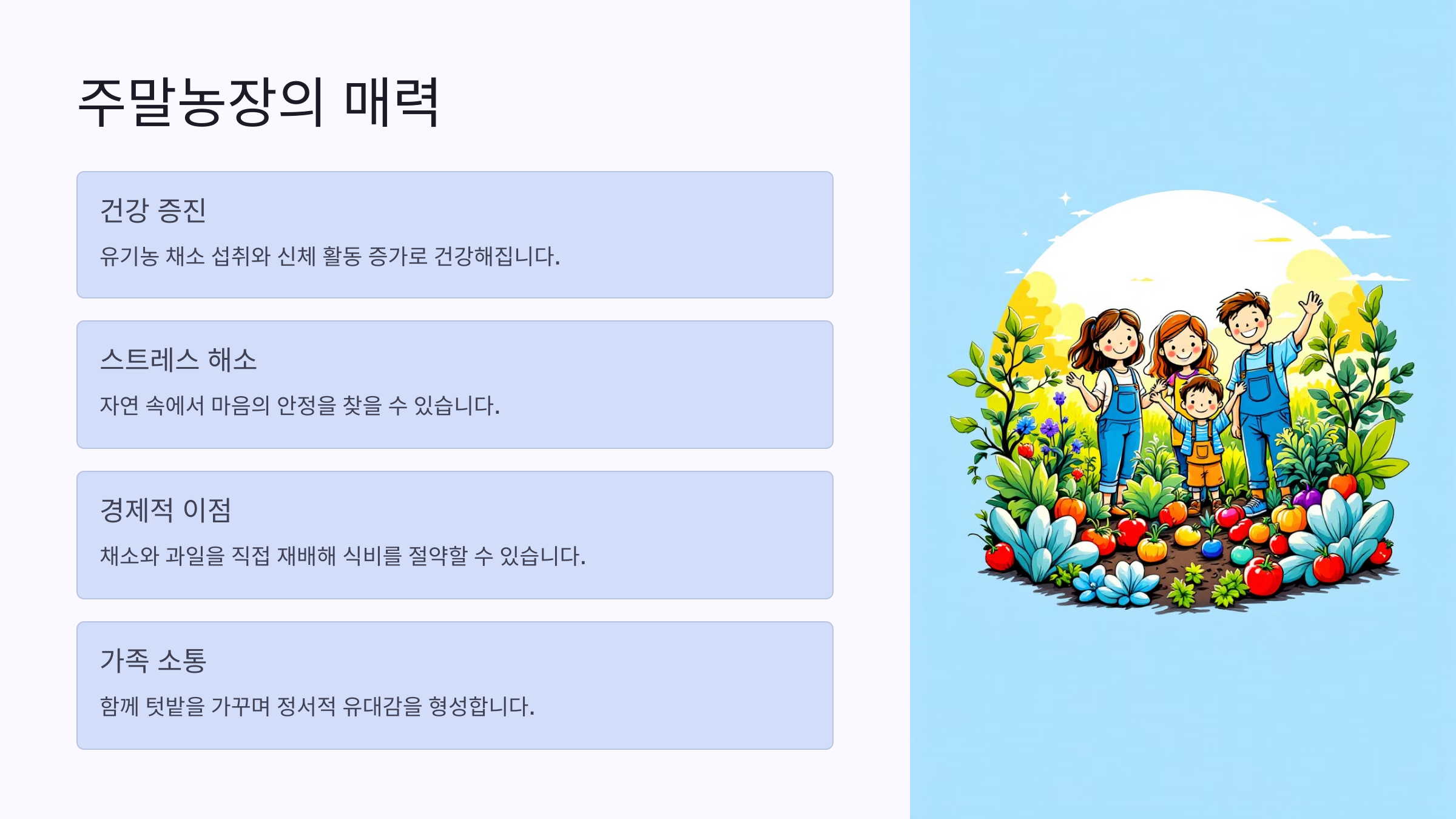 주말농장은 단순한 취미를 넘어 **건강, 힐링, 가족 간의 소통, 경제적 이점**까지 다양한 장점을 갖고 있어요.