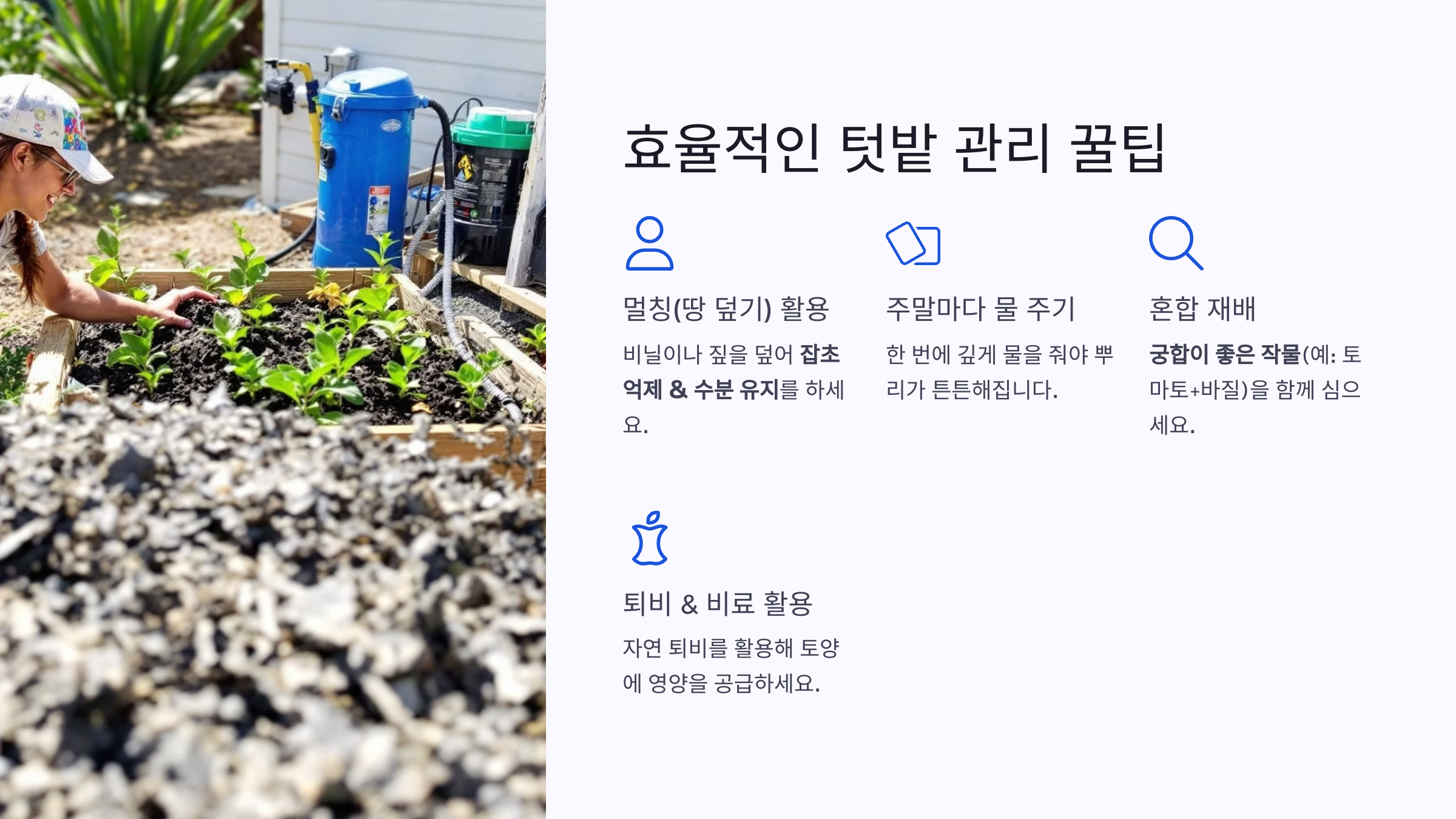 이 꿀팁만 잘 활용하면 **손쉽게 건강한 텃밭을 가꿀 수 있어요**! 🌱