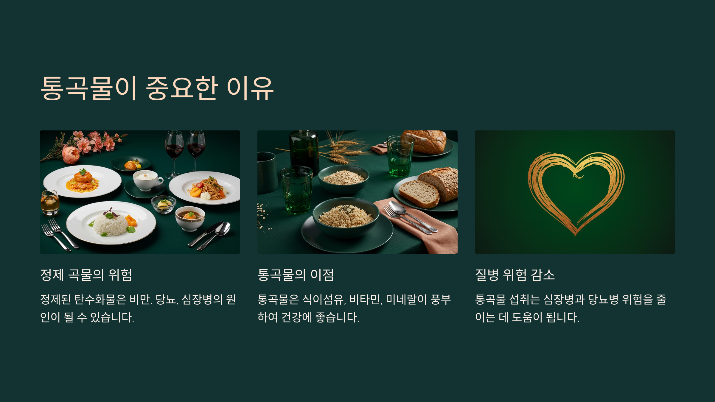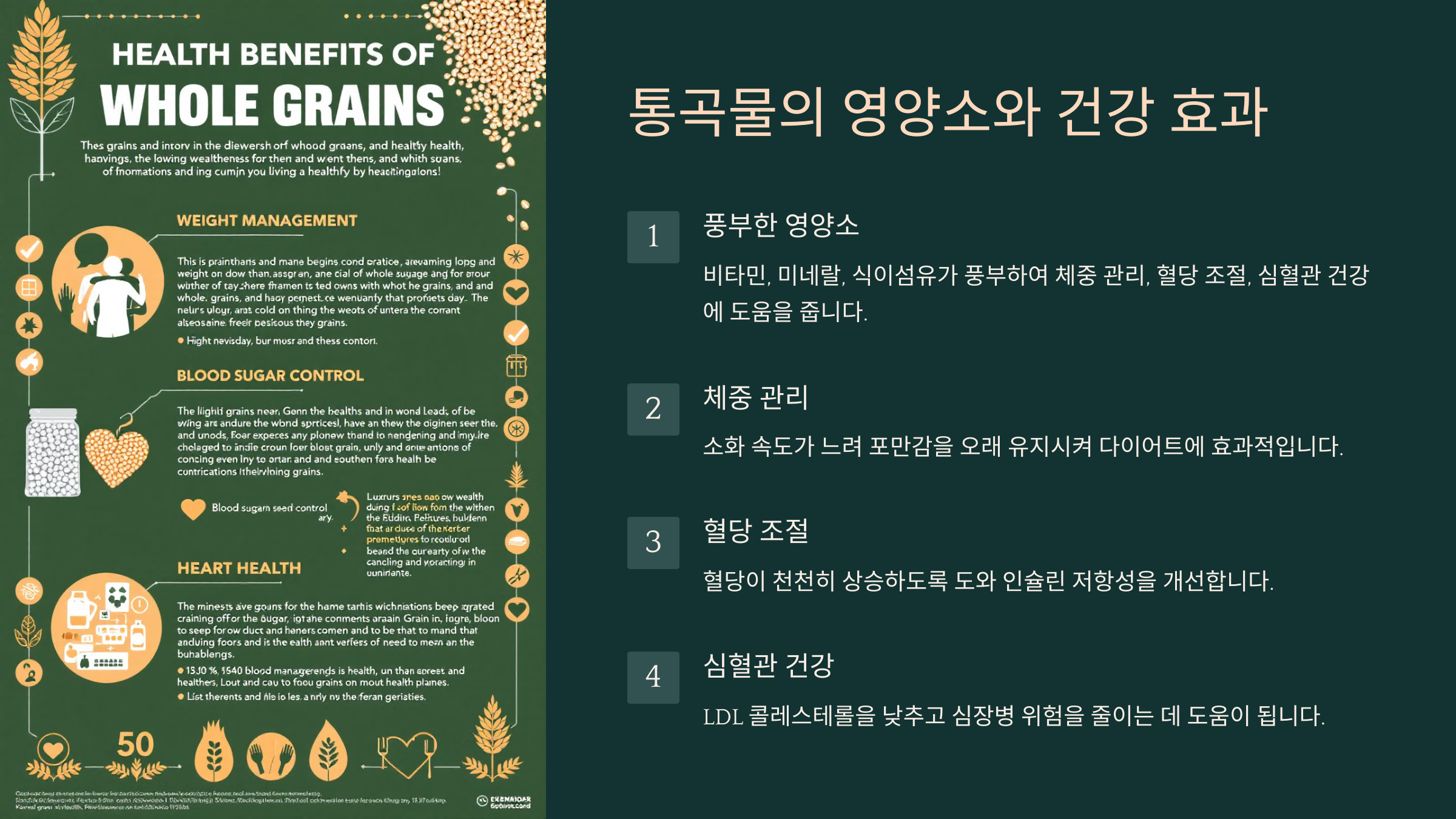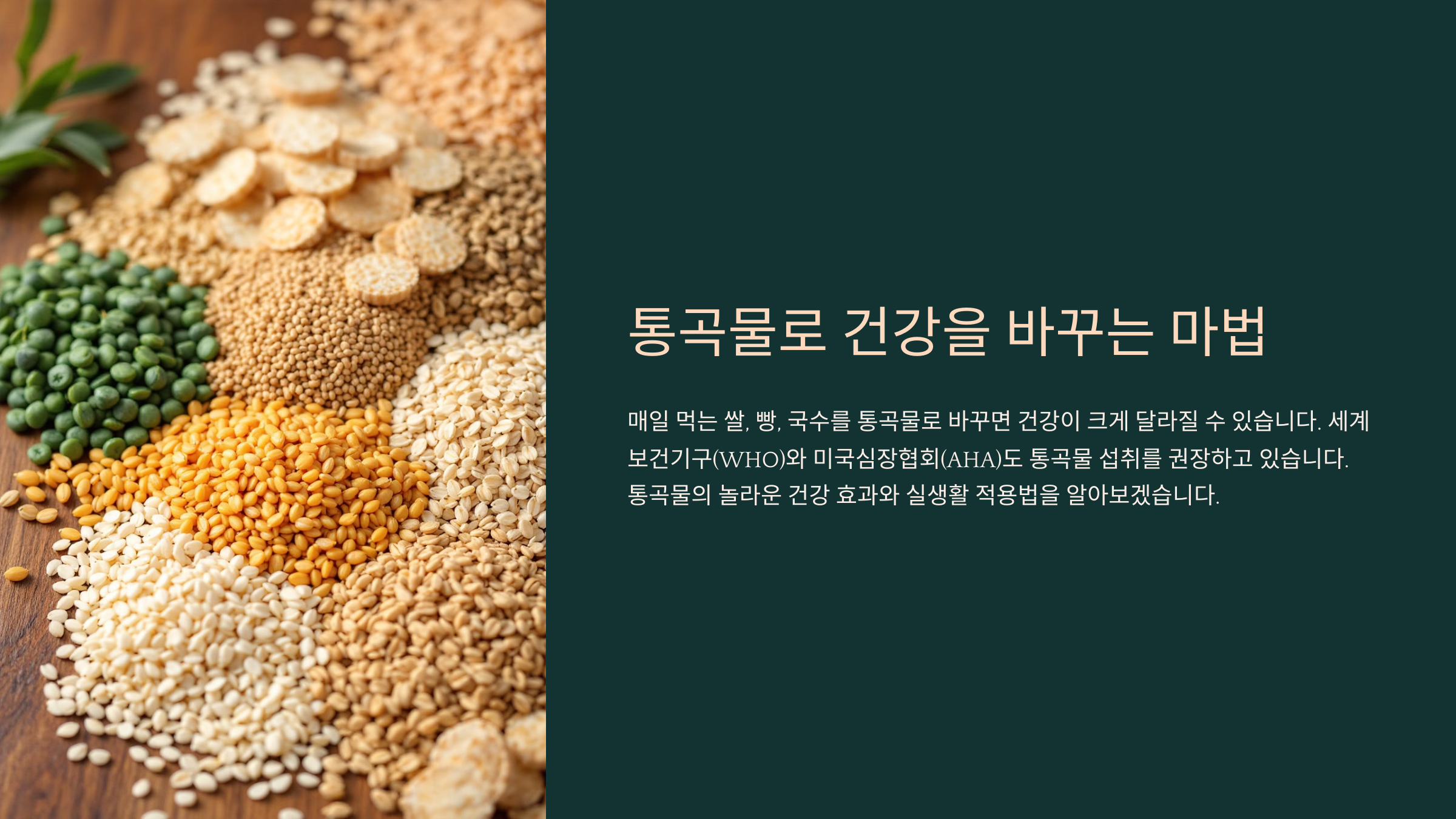 우리가 매일 먹는 **밥, 빵, 국수** 같은 탄수화물 식품을 **통곡물로 바꾸면** 건강이 크게 달라질 수 있어요. 🍚➡️🌾