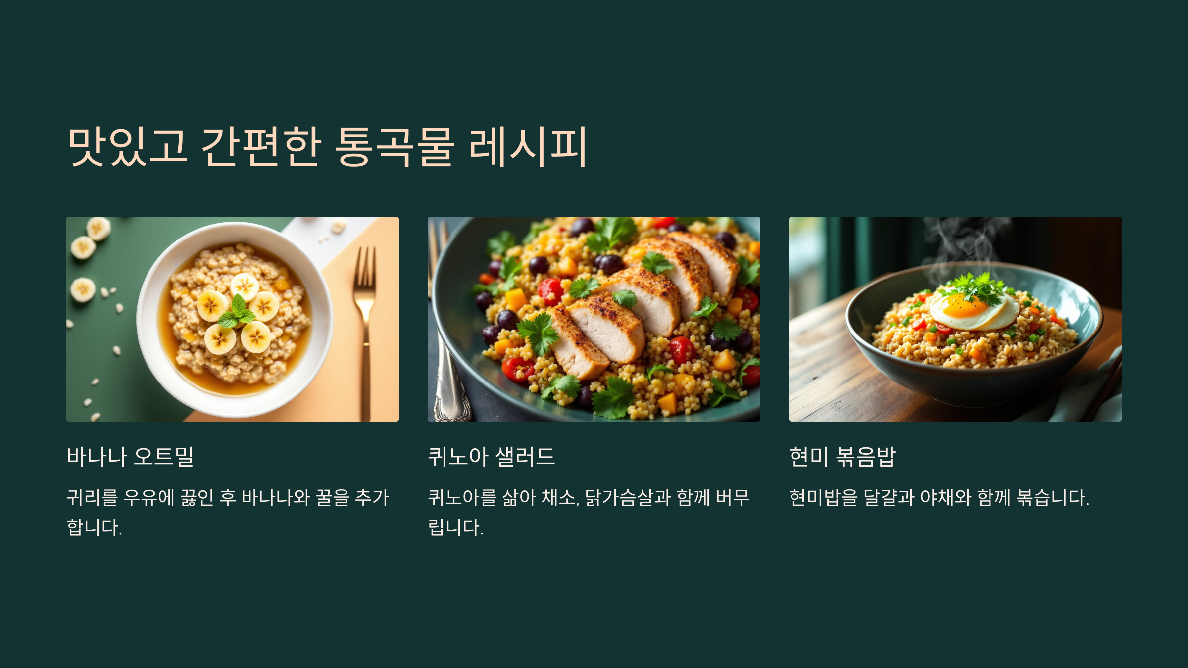 이제 체중 관리와 장 건강을 위한 **맛있는 통곡물 레시피**를 알아볼까요? 🍽️