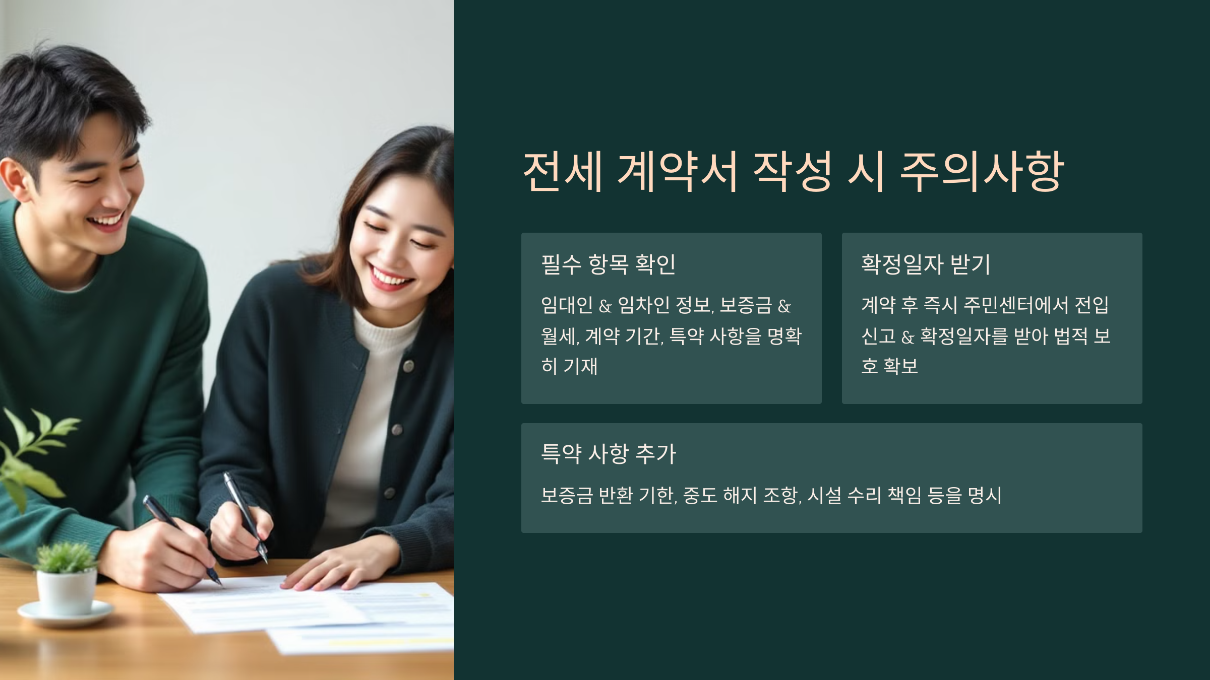 전세 계약서 작성은 보증금을 지키기 위한 가장 중요한 단계예요! 계약서에 문제가 있으면 법적 보호를 받기 어려울 수 있으니 꼼꼼하게 확인해야 해요. 🧐