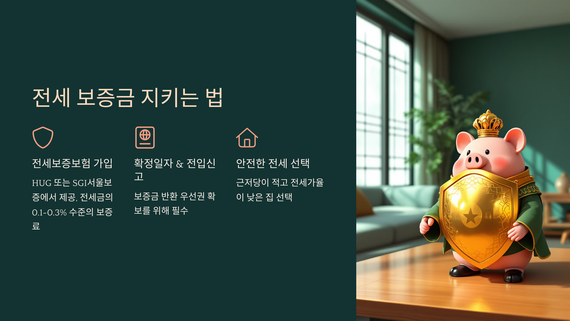 전세 보증금을 안전하게 지키기 위해서는 확정일자, 전세보증보험 가입, 안전한 입지 선택이 필수예요! 보증금을 잃지 않도록 철저히 대비해야 해요. 🔍