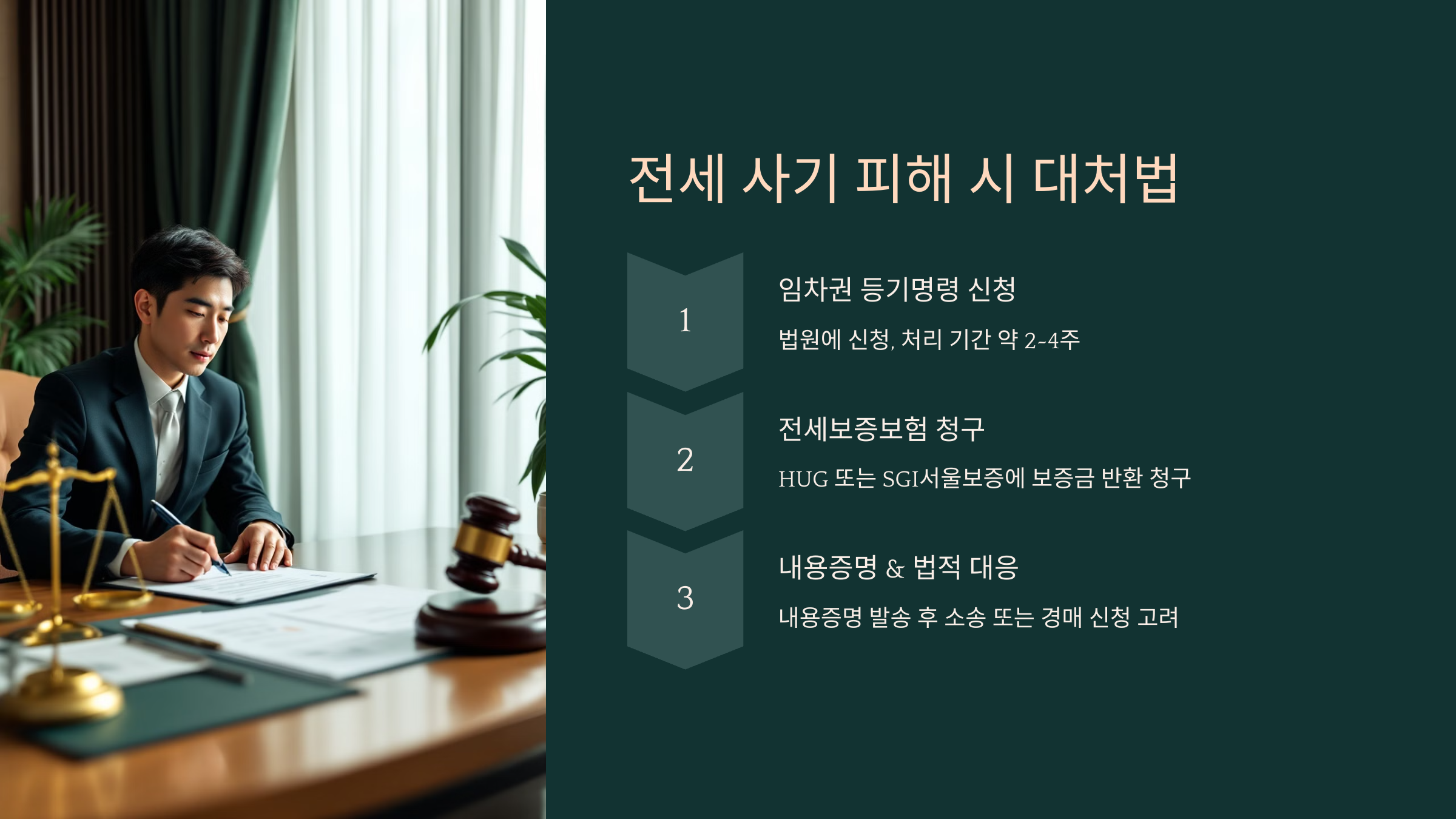만약 전세 사기를 당했다면 빠르게 법적 조치를 취하는 것이 가장 중요해요! 전세 보증금을 지키기 위해서는 임차권 등기명령, 소송, 보증보험 청구 등을 고려해야 해요. ⚖️