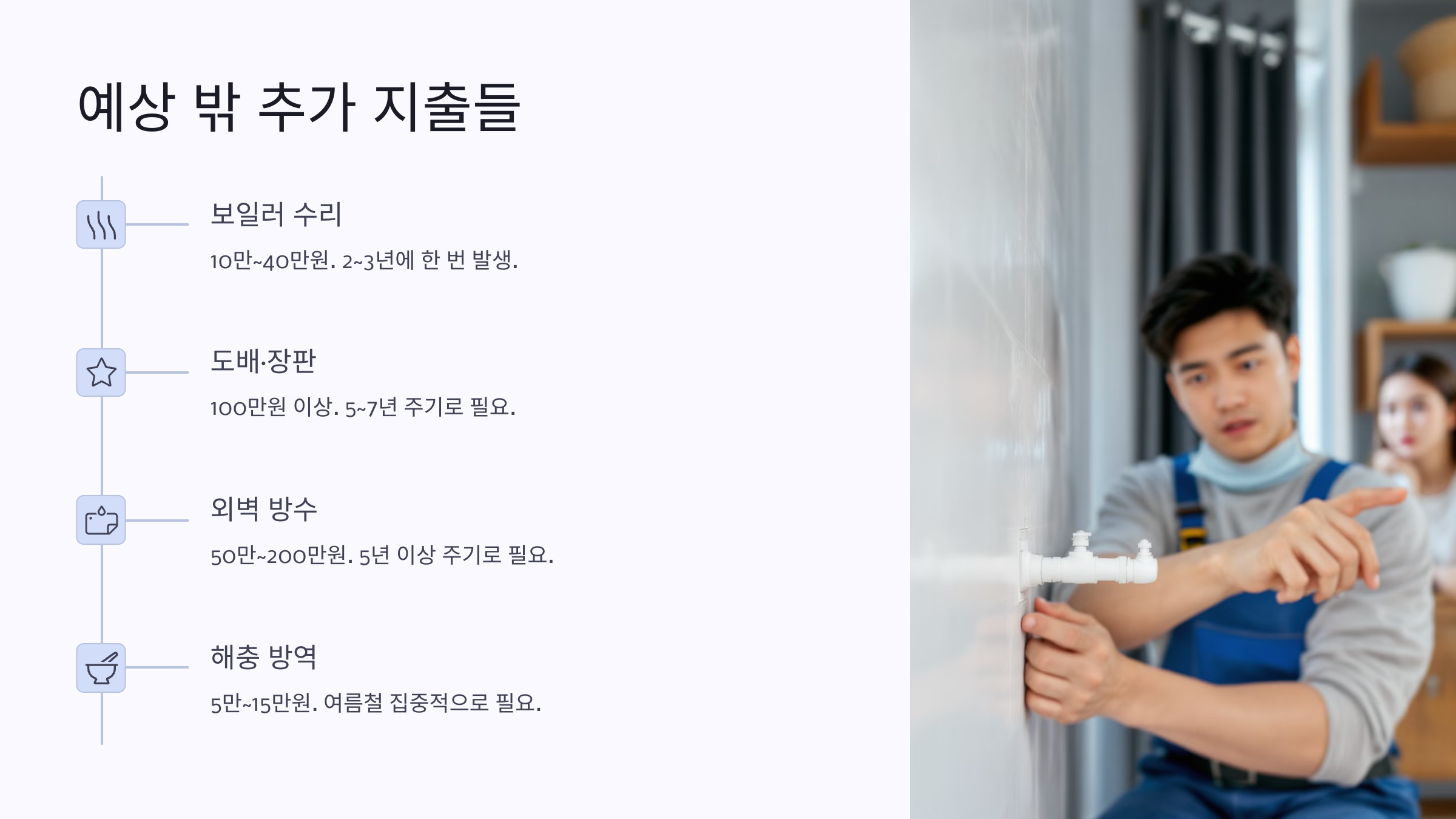 대표적인 추가 비용은 가전 수리비예요. 냉장고, 세탁기, 보일러 같은 가전은 고장이 날 경우 수리비가 10만 원을 넘기기 일쑤예요. 특히 보일러는 겨울철에 자주 문제가 생기고, 고장이 나면 실내 난방이 멈추기 때문에 급히 고쳐야 해요.