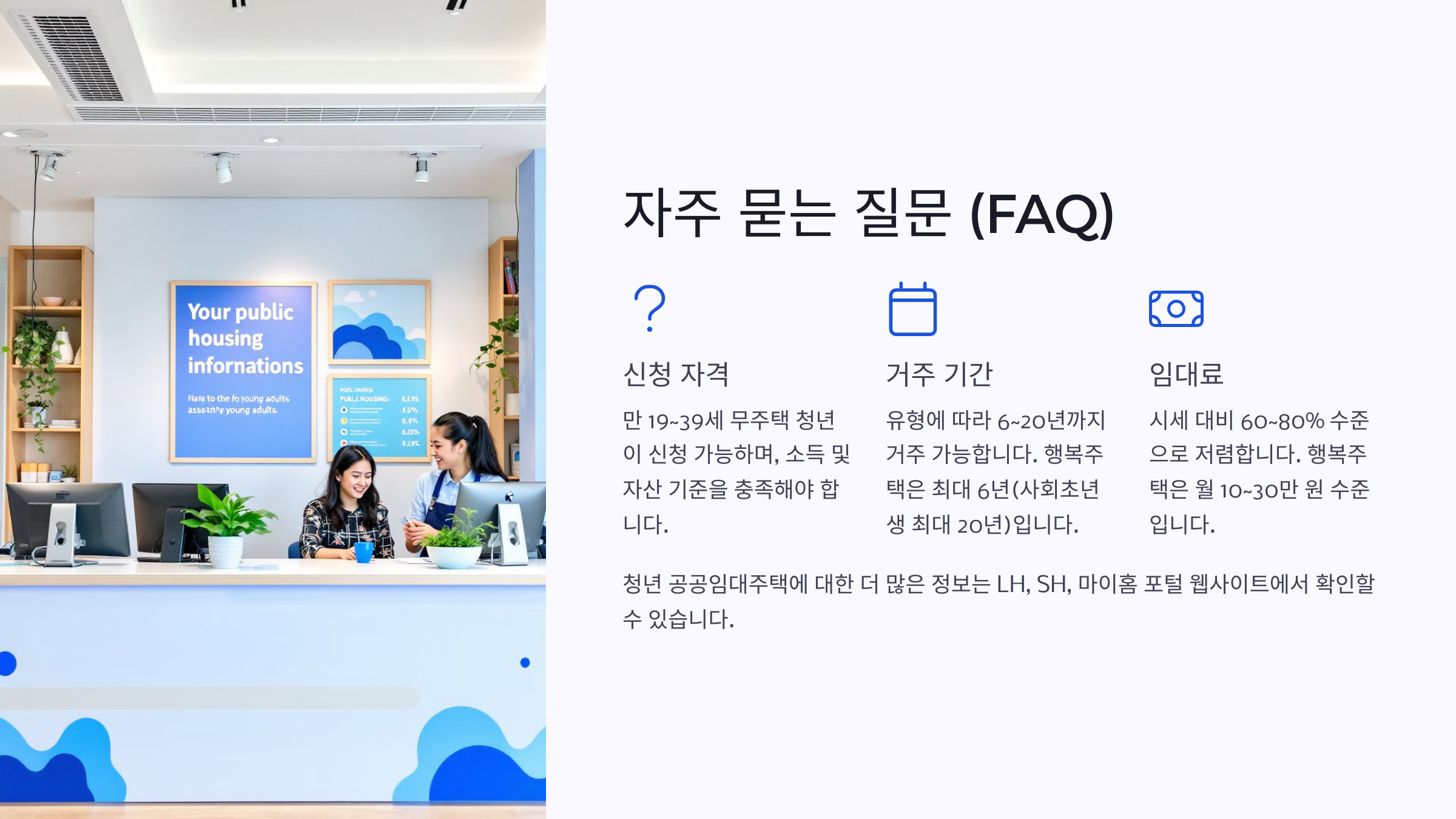 A3. 거주 기간은 유형에 따라 달라요. 행복주택은 최대 6년(사회초년생 최대 20년), 청년 매입·전세임대는 6년, 역세권 청년주택은 최대 10년까지 가능해요. 🕰️