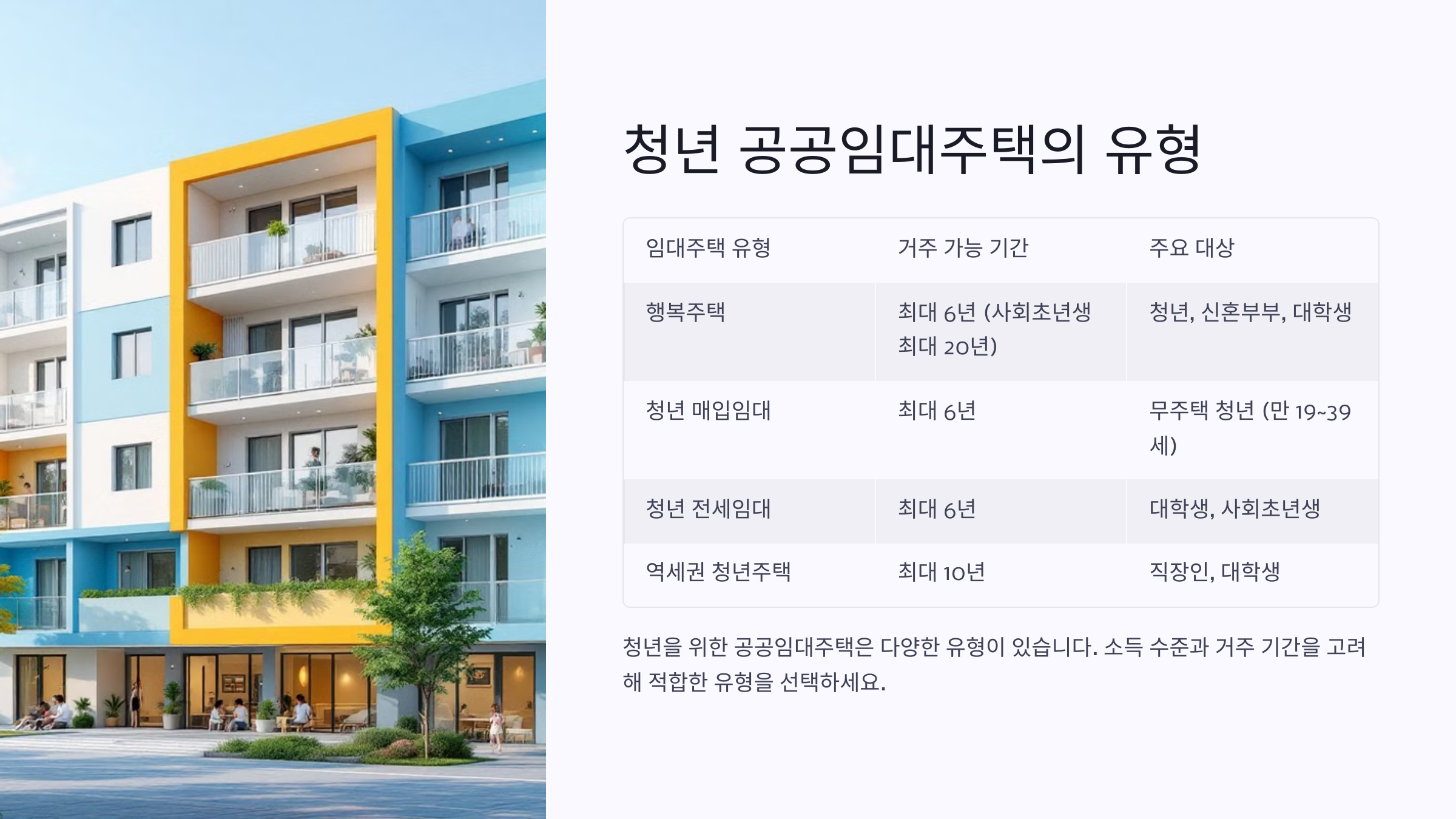 청년을 위한 공공임대주택은 다양한 유형이 있어요. 본인의 소득 수준과 거주 기간 등을 고려해 가장 적합한 유형을 선택하는 것이 중요해요. 🏠