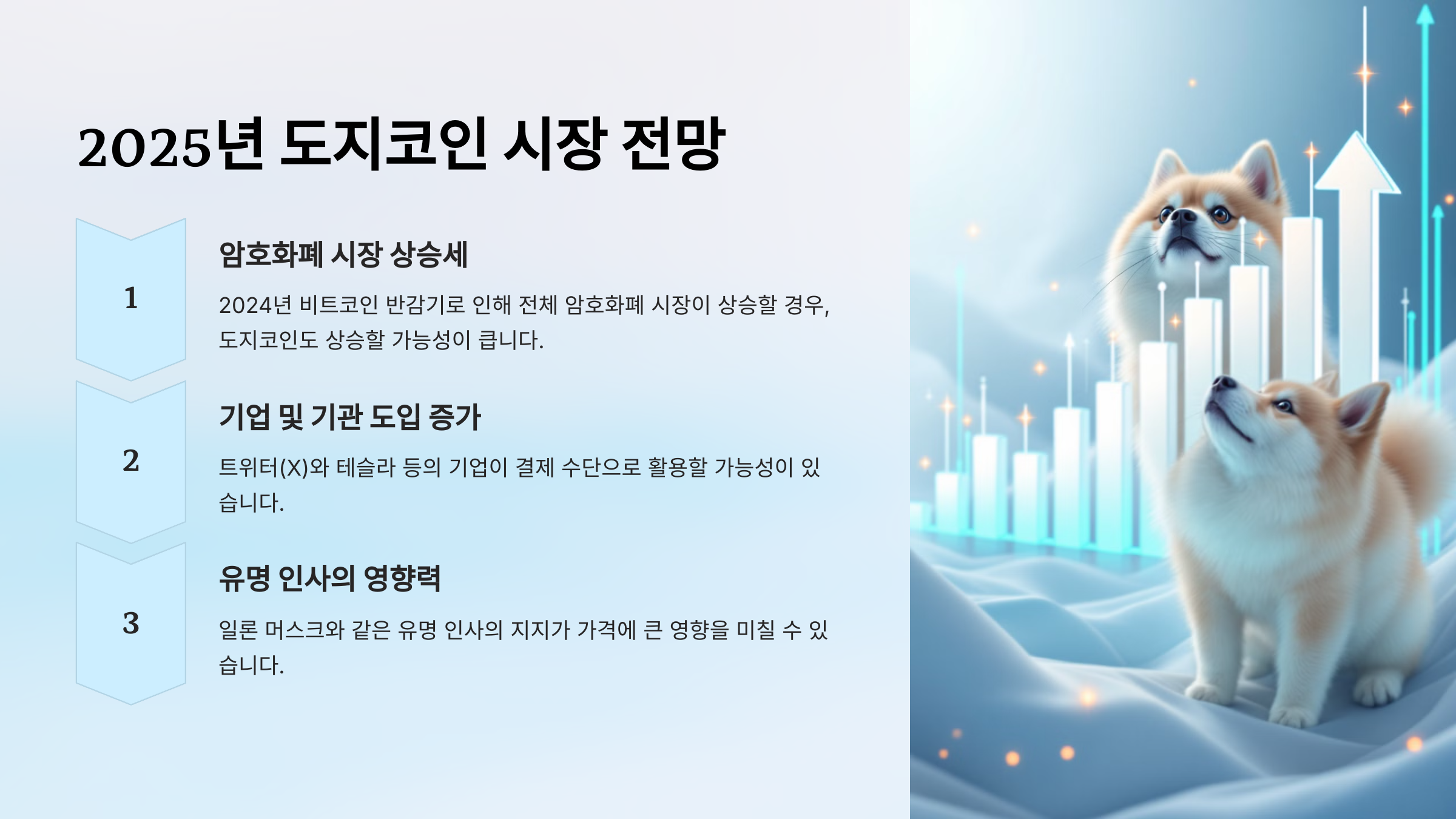 2025년 도지코인 시장은 크게 세 가지 요소에 의해 영향을 받을 것으로 보여요. 첫째, 암호화폐 시장 전체의 상승세, 둘째, 기업 및 기관의 도입 증가, 셋째, 일론 머스크와 같은 유명 인사의 영향력이에요.