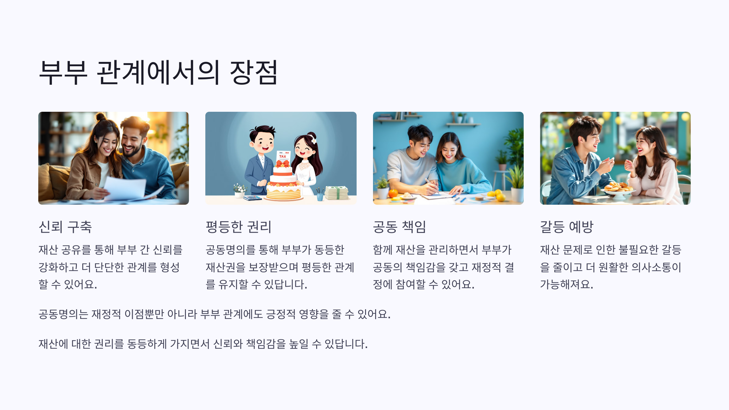 | 신뢰감 | 부부가 공동으로 책임을 가짐 | 재산 문제로 갈등 발생 가능 |