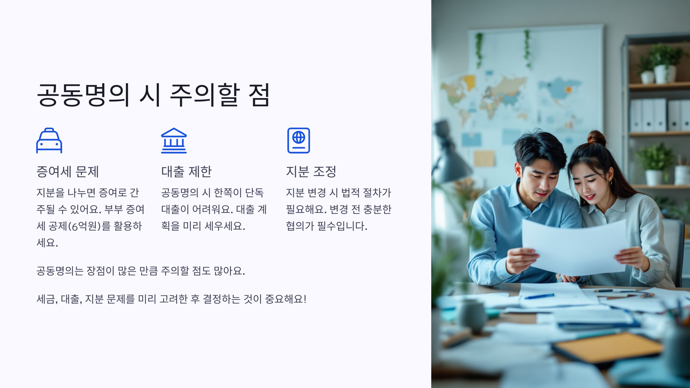공동명의는 장점이 많은 만큼 주의할 점도 많아요. 세금, 대출, 지분 문제를 미리 고려한 후 결정하는 것이 중요하답니다! 💡