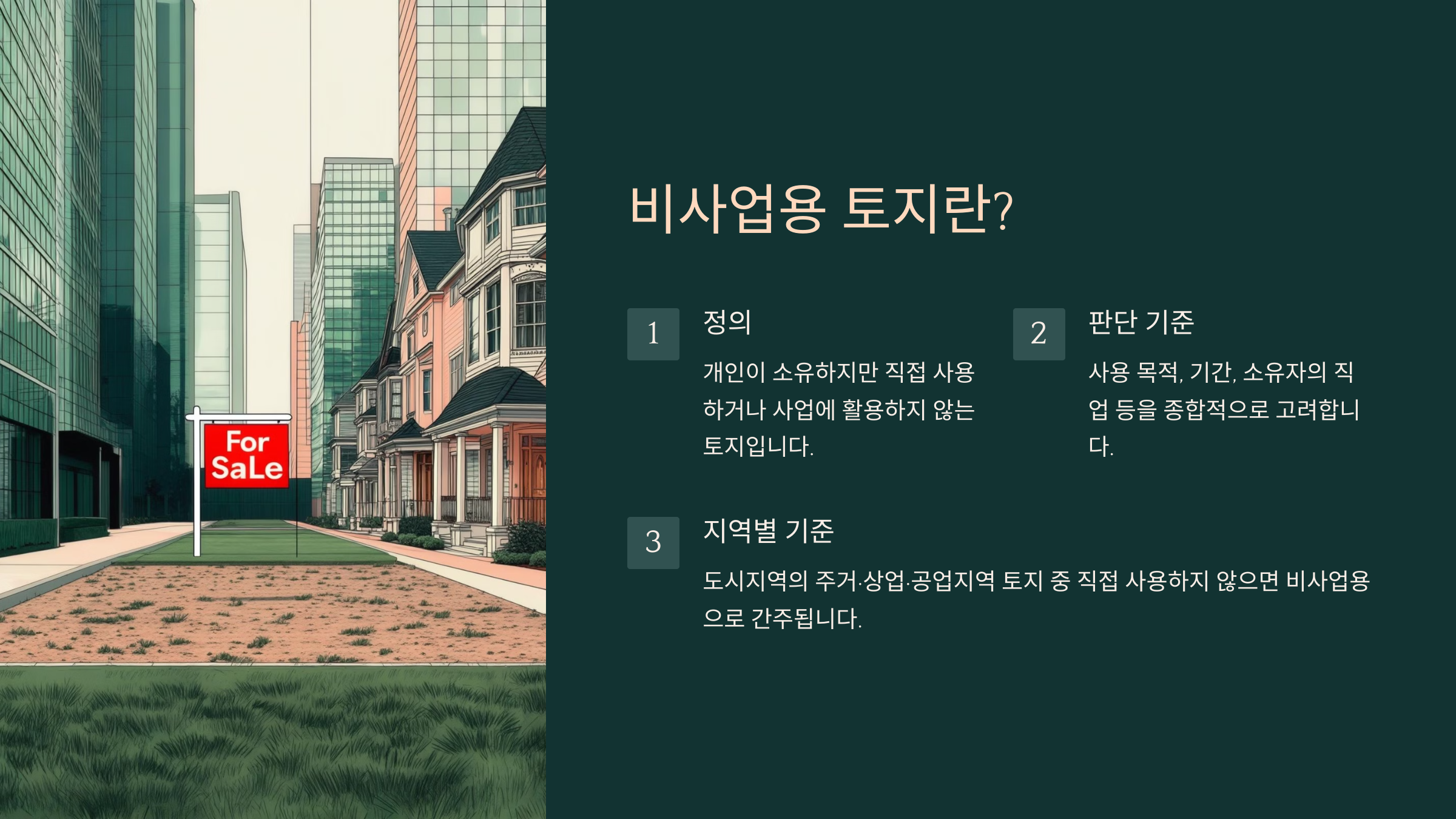 비사업용 토지는 개인이 소유하고 있지만 직접 사용하거나 사업에 활용하지 않는 토지를 말해요. 쉽게 말해, 투자 목적으로 보유하거나 사용하지 않는 땅이죠. 세법에서는 이러한 토지에 더 높은 세율을 적용해 투기 방지와 조세 형평성을 유지하고 있어요.