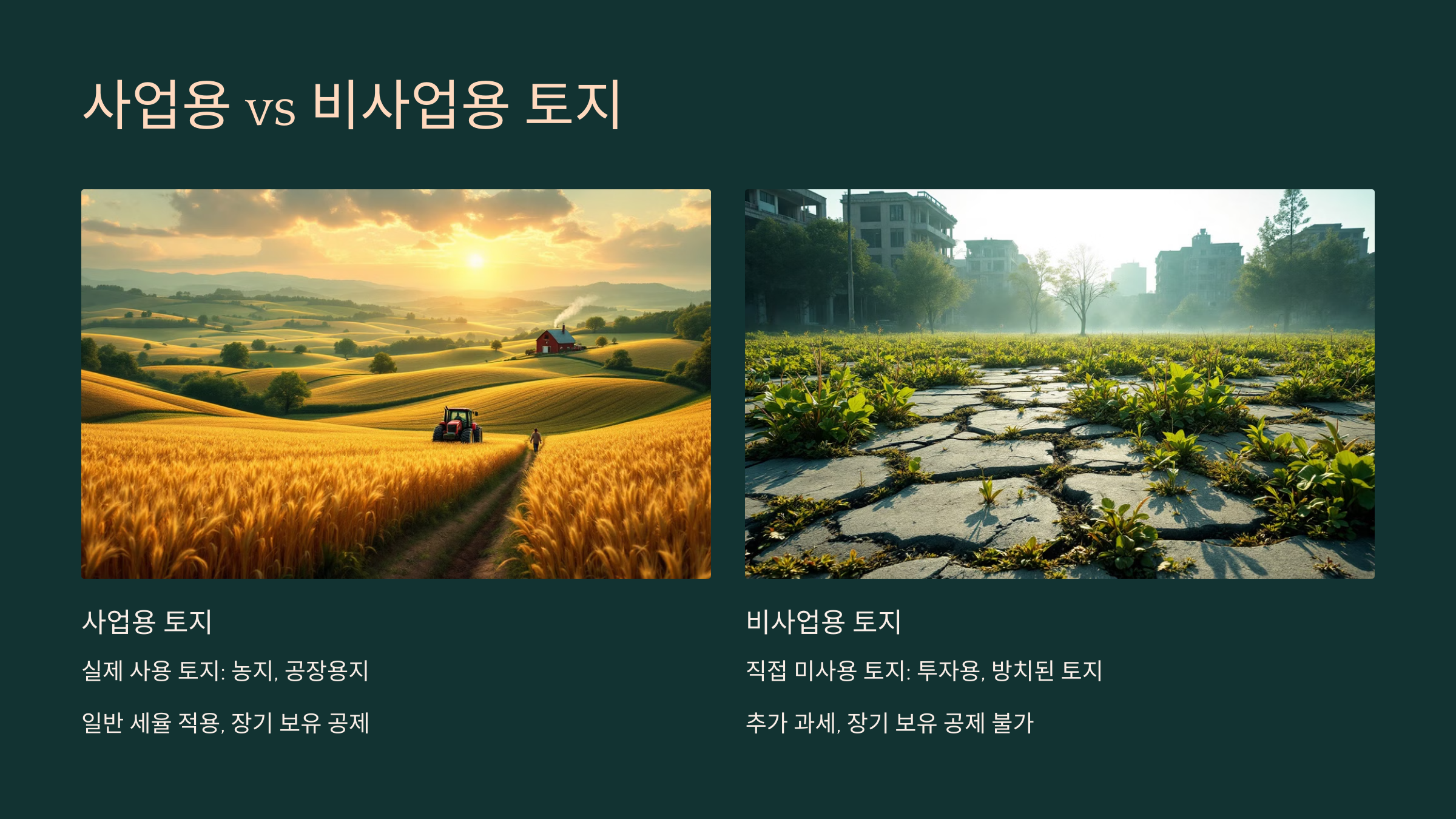 | 사용 여부 | 직접 사용 (농지, 공장 등) | 사용하지 않음 (투자 목적) |