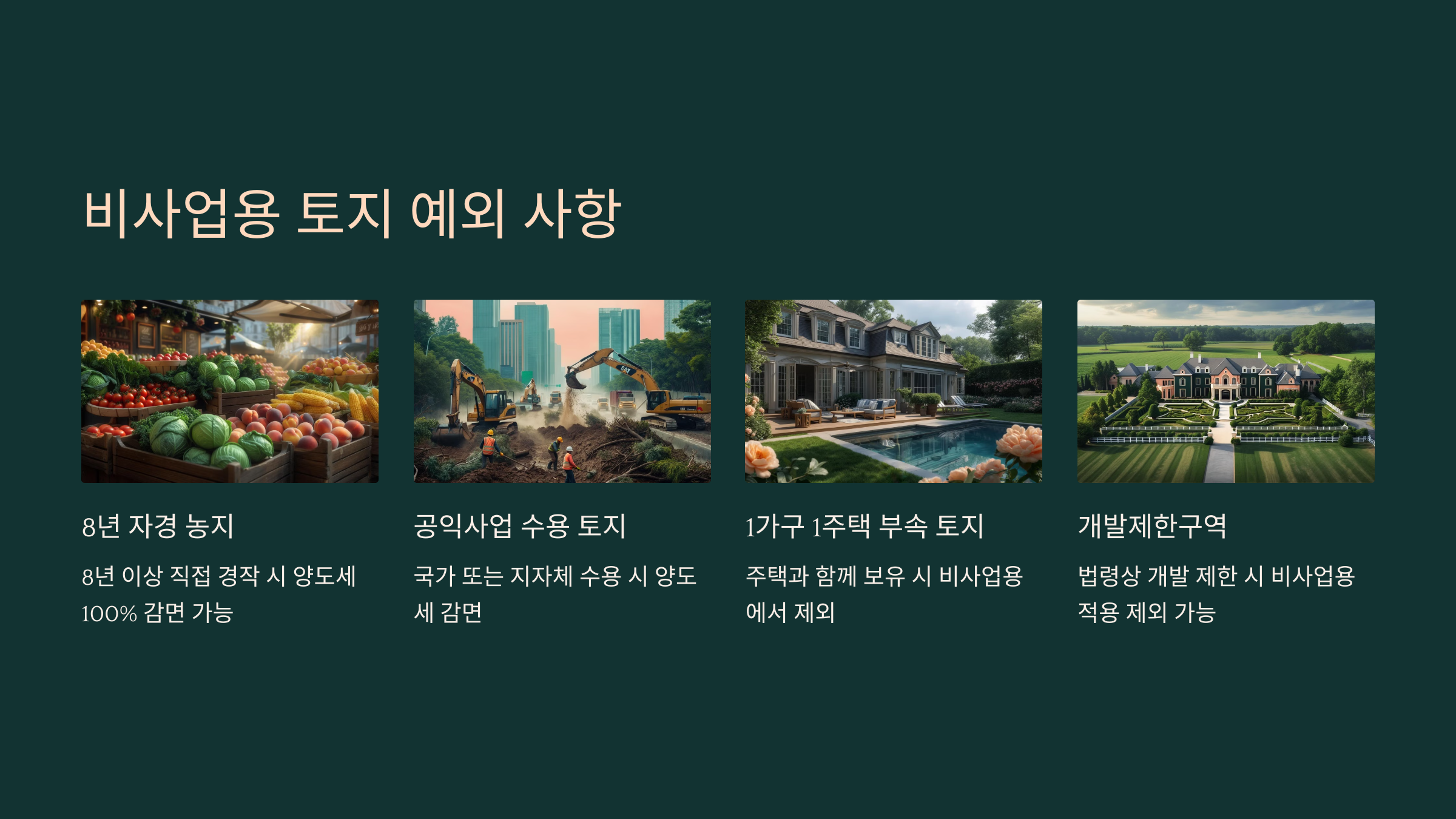 | 예외 조항 활용 | 비사업용 적용 제외 | 농업인, 1가구 1주택자 등 | 요건 미충족 시 과세 |