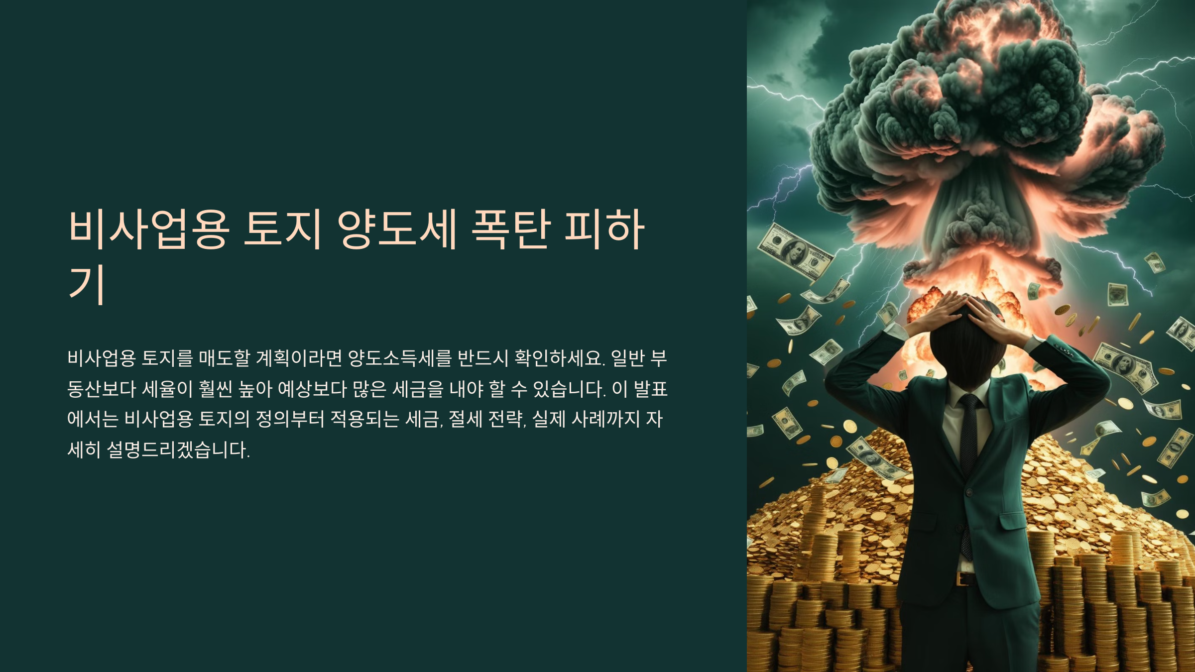 📢 비사업용 토지를 매도할 계획이라면 양도소득세를 반드시 확인해야 해요. 일반 부동산보다 세율이 훨씬 높기 때문에 예상보다 많은 세금을 내야 할 수도 있거든요. 자칫하면 ‘양도세 폭탄’을 맞을 수도 있답니다. 💸