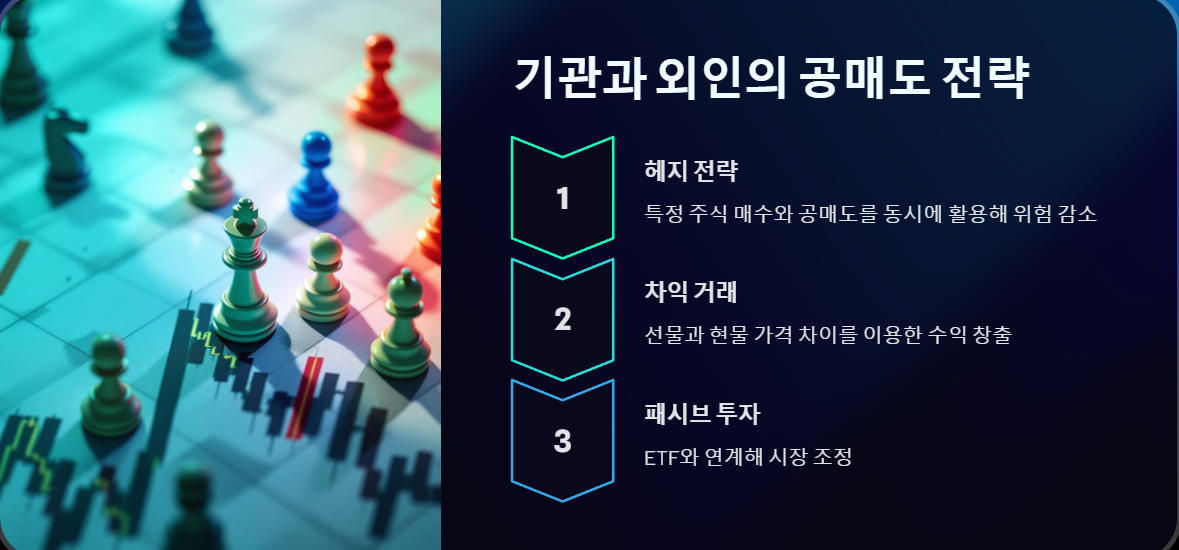 기관과 외국인은 공매도를 단순한 주가 하락 수단으로 사용하지 않아요. 오히려 시장 흐름을 조절하거나, 리스크 헤지(위험 회피) 전략으로 활용하는 경우가 많아요.