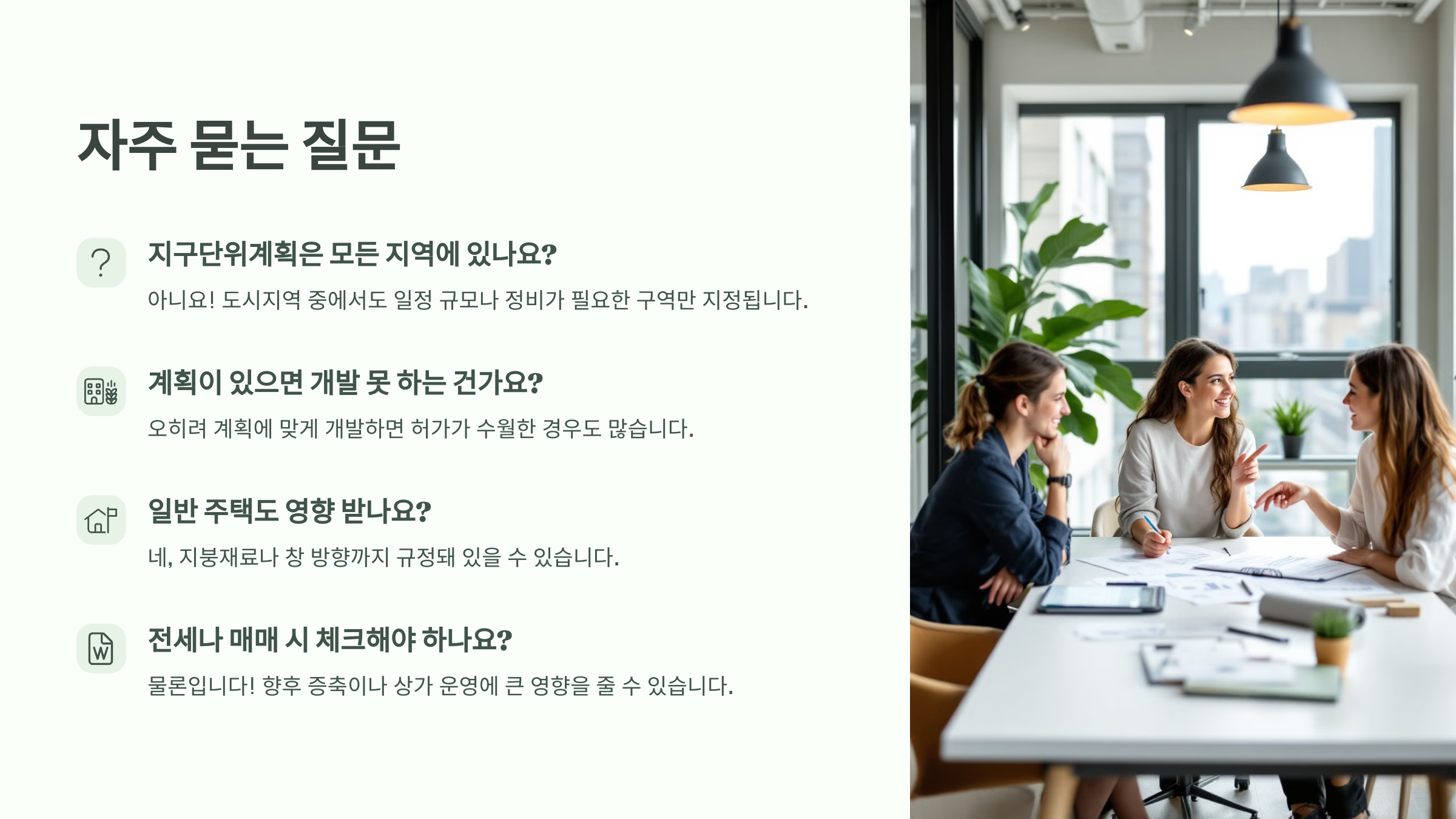 이처럼 지구단위계획은 '개발 금지'가 아니라, '계획된 방향으로 유도'하는 개념이에요. 단순히 규제만 보지 말고, 잘 활용하면 지역 가치가 올라가요!
