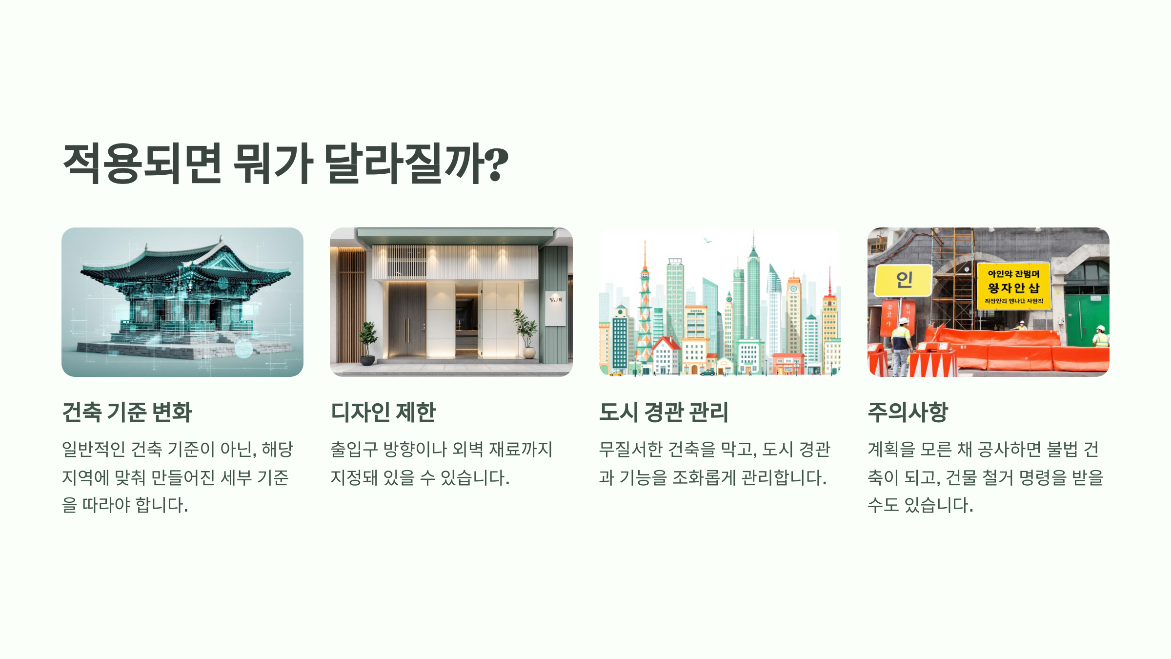 | 건축물 디자인 | 자유로운 설계 가능 | 색상, 재질, 간판 제한 가능 |