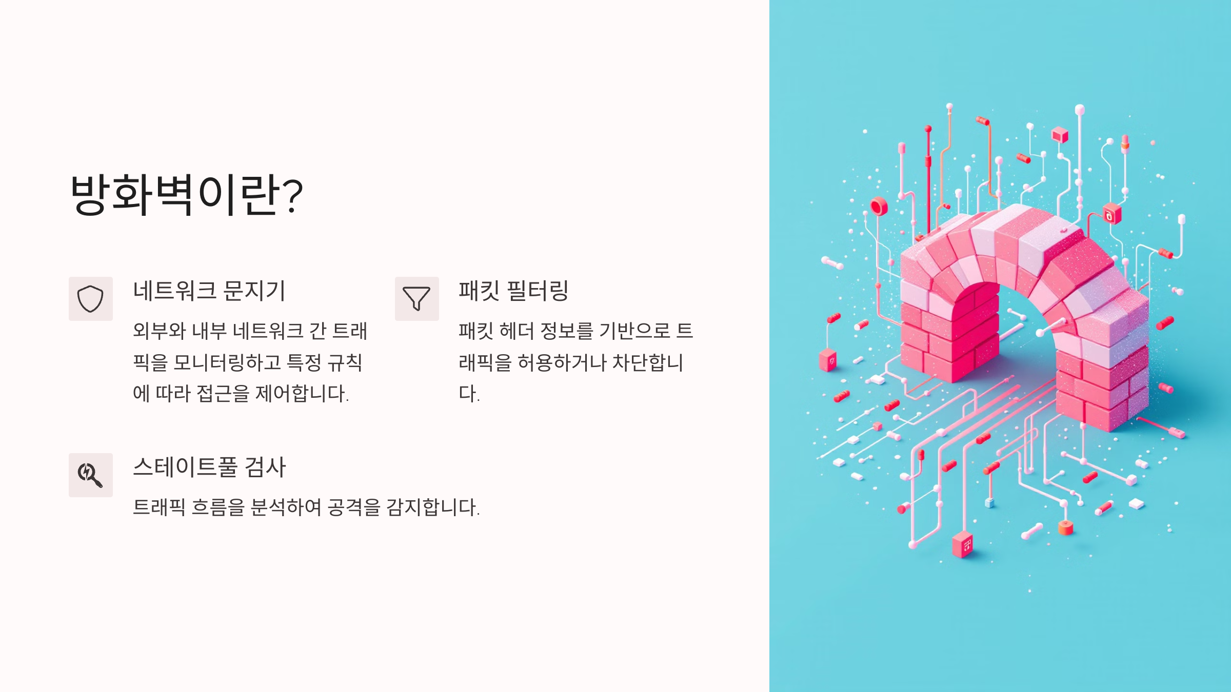 방화벽(Firewall)은 외부 네트워크와 내부 네트워크 간의 트래픽을 모니터링하고, 특정 규칙에 따라 접근을 차단하거나 허용하는 보안 시스템이에요. 쉽게 말해 네트워크의 '문지기' 역할을 하는 거죠.