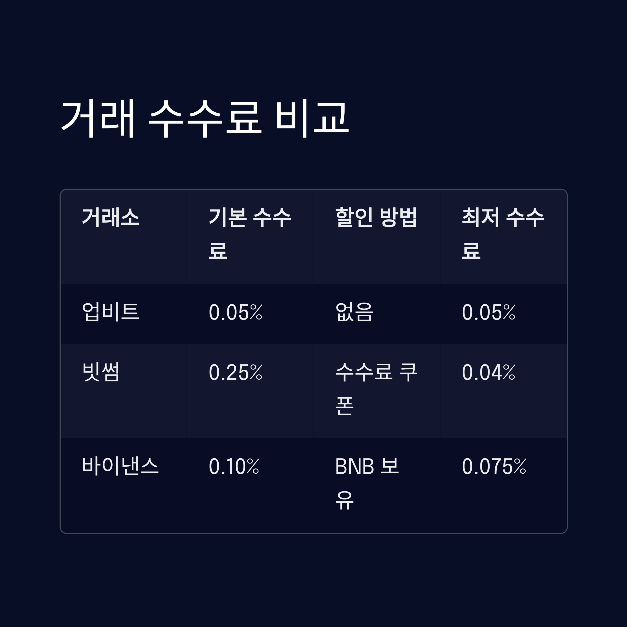 | 거래소 | 기본 수수료 | 할인 수단 | 최소 수수료 |