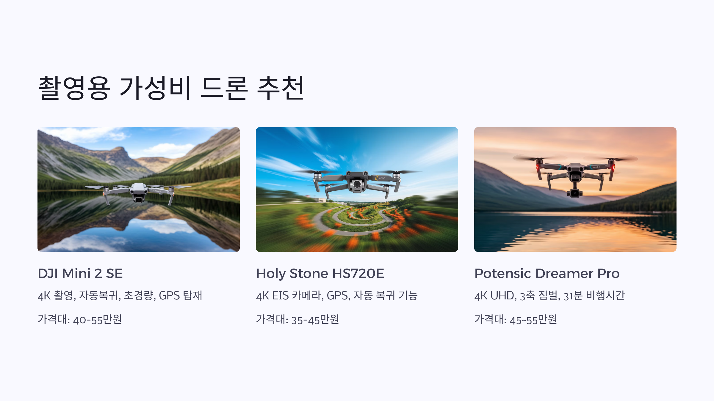 지금부터 가성비 촬영 드론 베스트 3을 소개할게요. 이 정도면 유튜브 촬영, SNS 영상용으로 충분히 활용 가능해요!